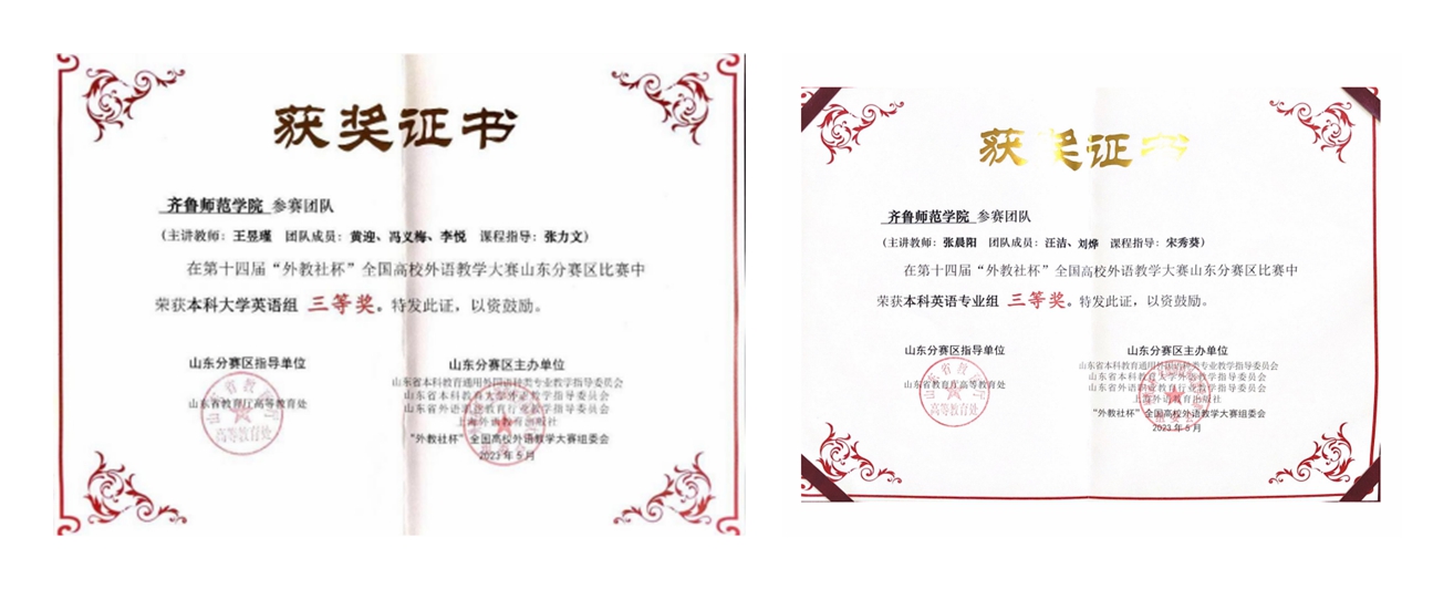 本届“外教社杯”全国高校外语教学大赛山东分赛区比赛由山东省本科教育通用外国语种类专业教学指导委员会、山东省本科教育大学外语教学指导委员会、山东省外语职业教育行业教学指导委员会和上海外语教育出版社联合主办,山东大学(威海)承办,分为本科英语专业组、本科大学英语组、高职公共英语组三个组别,省内110所高校的143个团队报名参赛。经过初赛、复赛和决赛的激烈角逐,最终,全讯白菜官网外国语学院教师张晨阳团队(团队成员:汪洁、刘烨;课程指导:宋秀葵)荣获本科英语专业组三等奖,王昱瑾团队(团队成员:黄迎、冯义梅、李悦;课程指导:张力文)荣获本科大学英语组三等奖。