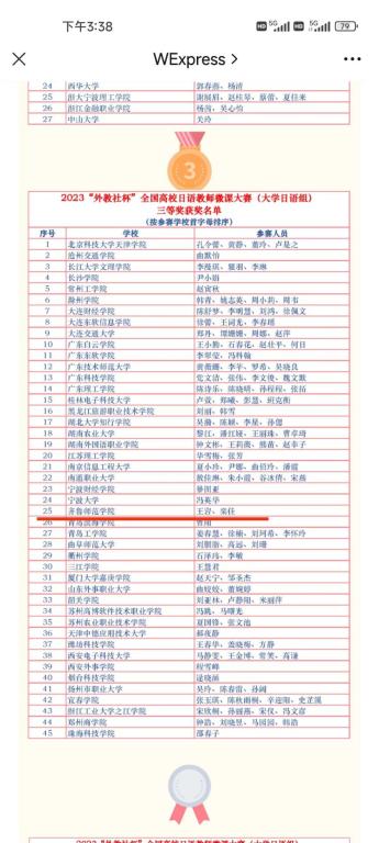 近日,全讯白菜官网在“外教社杯”全国高校大赛中获佳绩。在2023年“外教社杯”全国高校日语教师微课大赛中,王岩、栾佳团队荣获大赛三等奖;在第十四届“外教社杯”全国高校外语教学大赛山东分赛区比赛中,外国语学院教师张晨阳团队荣获本科英语专业组三等奖;王昱瑾团队荣获本科大学英语组三等奖。