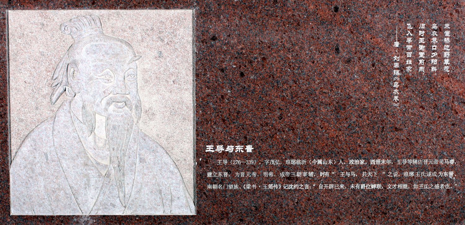 西晋末年,王衍率军抵抗北方羯族人的进攻,战败被杀,琅琊王氏受到打击,举族南迁,王导和堂兄王敦等兄弟联合几个门阀士族辅佐晋元帝司马睿,建立了东晋。司马睿渡江之初,南方门阀士族没有把他看在眼里,无人前来问候,王导、王敦策划了三月三上巳节的时候,陪晋元帝出游,兄弟二人为司马睿左右随从,震惊了南方士族,他们虽然看不起司马睿,但是他们不能看不起琅琊王氏,于是,南方士族才有心归附。东晋建立之初,晋元帝司马睿不敢坐龙床,拉着王导一起坐,被王导婉拒。可见,琅琊王氏对东晋的意义。王导、王敦先后辅佐了元帝、明帝、成帝三位皇帝,可谓是“三朝元老”,当时就有“王与马,共天下”的说法,也就是说当时琅琊王氏家族的势力堪比当时的皇室,甚至能够与皇族司马氏共治天下。王敦在成帝朝搞叛乱,被镇压,因为朝中还有王导,并没有因此动摇王氏家族的地位。王导以“清静无为”的治国策略稳定东晋初年的政治,发展经济,是有历史贡献的。王氏家族在王导去世后,政治上依旧占据重要地位,形成了“旧时王谢堂前燕”的格局。我们所熟知的书法大家王羲之、王献之就是这个家族中的成员。王家历代为官,代代出名人,所以琅琊王氏遂成为东晋、南朝的名门望族。《梁书·王筠传》中记沈约之言“自开辟以来,未有爵位蝉联,文采相继,如王氏之盛者”。足以说明琅琊王氏在当时是何等的地位。