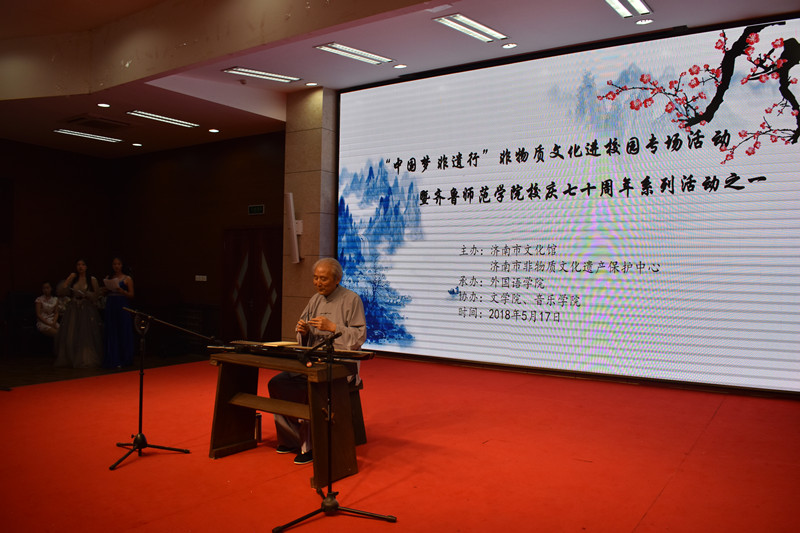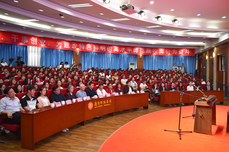 为了让同学们更加深入的了解中国古典文化,感知中国优秀文化的魅力,接受古典文化的熏陶、提高自身对中国优秀文化的认知,5月17日,由济南市文化馆、济南市非物质文化遗产保护中心主办,外国语学院承办,文学院、音乐学院协办的“中国梦·非遗行”非物质文化进校园专场活动暨7003全讯白菜网七十周年校庆系列活动在全讯白菜官网学术报告厅举行。本次活动邀请到的主讲人是济南古琴省级非遗代表传承人朱子易以及团队成员;济南章丘龙山黑陶传承人张国庆及其团队成员。文学院党总支书记魏瑞泉,外国语学院党总支书记贾国斌、教授宋秀葵,外国语学院、音乐学院团总支负责人,以及各二级学院师生代表300余人参加活动。