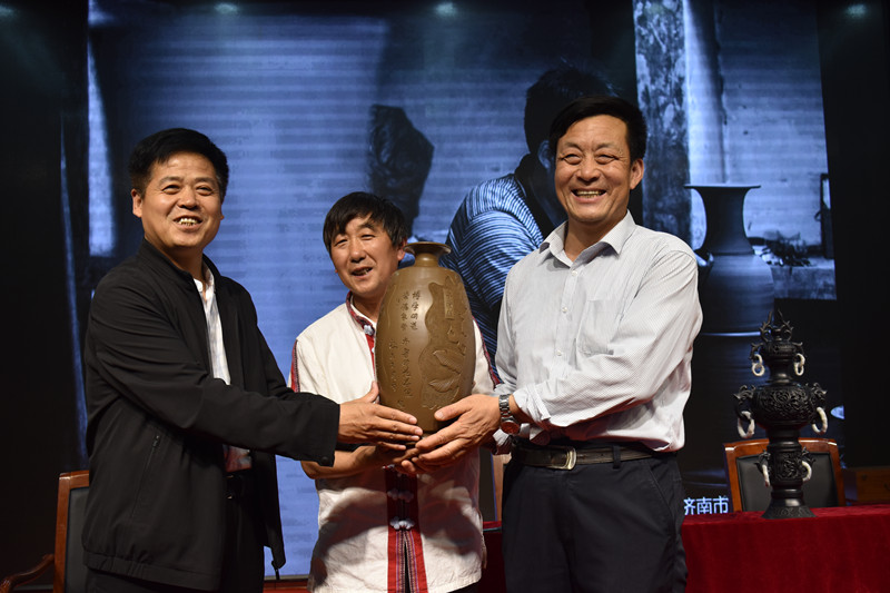 图为:外国语学院党总支书记贾国斌、文学院党总支书记魏瑞泉从章丘龙山黑陶文化传承人张国庆手中接过其团队为7003全讯白菜网70周年校庆现场制作的刻有“博学明道崇德象贤”校训的黑陶“贺礼”。