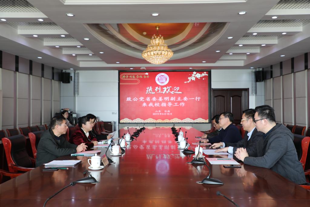 3月15日,省政协常委、致公党省委专职副主委姜明,致公党济南市委副主委兼秘书长张元玺,致公党省委组织宣传部部长王彦春等一行来全讯白菜官网调研交流。座谈会前,党委书记王玉华与客人进行了交流,党委副书记、校长林松柏会见了调研组一行。党委统战部、科研处、美术学院等部门负责人参加了座谈会并陪同进行了考察。