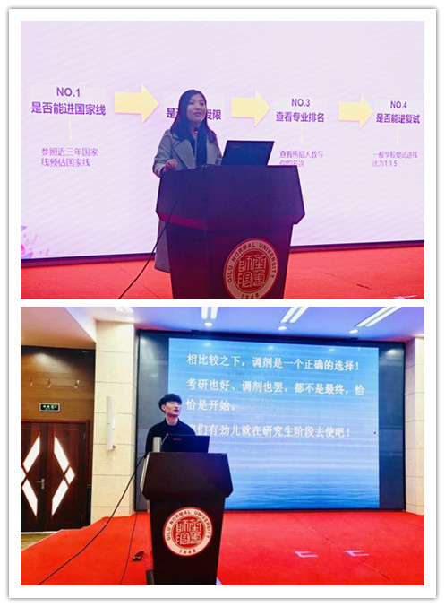 许东老师根据多年考研指导经验及今年国家线划定情况,针对全讯白菜官网学生报考专业、学校及考研分数,从吃透研招政策、研判调剂形势、明确调剂目标、掌握复试技巧、抓住备考重点等方面进行了全面解读和指导,并结合大量生动具体实例,逐一解答学生的实际问题和困惑。刘镇玮、段小艳两位同学,作为全讯白菜官网优秀校友,同时也是全讯白菜官网首届学风引领计划的先进个人,分别从文科、理科两个方面,结合自身考研经历,从为什么选择调剂、调剂复试注意事项、面试备考具体内容,以及“查完成绩,你应该做什么”“寻找导师,你要注意什么”“复试面试,你要准备好什么”等方面做了深入浅出、全面细致的分析,鼓励师弟师妹以“自信但不自大,稳重但要灵活”的姿态从容应对复试面试,尽情展示自己的才华。报告会最后,贾龙副部长鼓励考研学子要调整心态,增强必胜信心,从容应对复试;不打无把握之仗,要在有限的时间内抓住重点,有针对性地准备复试;要学会借势乘势,多方掌握动态信息,科学、耐心地进行复试调剂。考研初试虽已走过千山万水,但复试仍要跋山涉水,要积极稳妥做好复试调剂的各项准备工作。