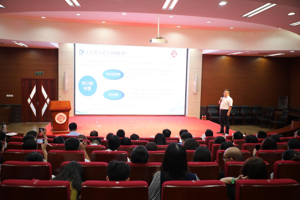教务处处长梁承锋详细讲解学分制教学管理规范,阐述实行学分制给教学管理、授课、收费带来的变化,以及学生选课与学生缴费的关系等。