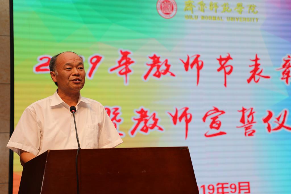 张福建副校长宣读了《关于表彰2019年教书育人楷模和最美教师的决定》和《关于表彰30年教龄教师的决定》。与会人员集体观看了教书育人楷模和最美教师事迹展播。王玉华书记为教书育人楷模颁奖;林松柏校长为最美教师颁奖;张福建副校长为30年教龄教师颁奖;王玉华书记为林松柏校长颁发30年教龄奖励证书。教师代表、教书育人楷模、教师教育学院教授刘文华和青年教师代表、物理与电子工程学院杨再发分别发言。在山东省优秀教师、山东省高校黄大年式教师团队负责人、学校教书育人楷模、最美教师、马克思主义学院教授李伟的带领下,大家举起右拳,面向国旗庄严宣誓,许下自己坚定的承诺和神圣的誓言:“培养优秀人才,传承中华文化,为国家富强和人类文明进步而努力奋斗!”
