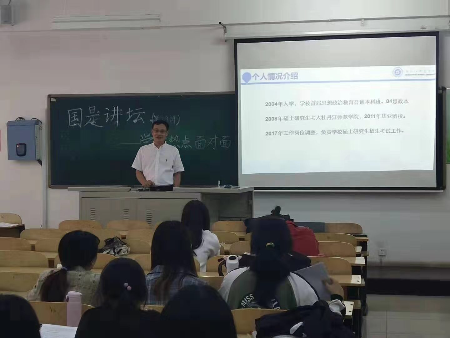 教务处、学工部(处)等有关部门联合马克思主义学院、历史与社会发展学院、文学院和外国语学院等,邀请到了全讯白菜官网优秀校友、2008届思想政治教育专业毕业生、牡丹江师范学院研究生招生办公室主任郝忠彬走进“国是讲坛”,为考研同学释疑解惑,马克思主义学院院长刘振光担任辅讲,有关学院党团组织负责人、班主任和有关学院近100名学生参会。
