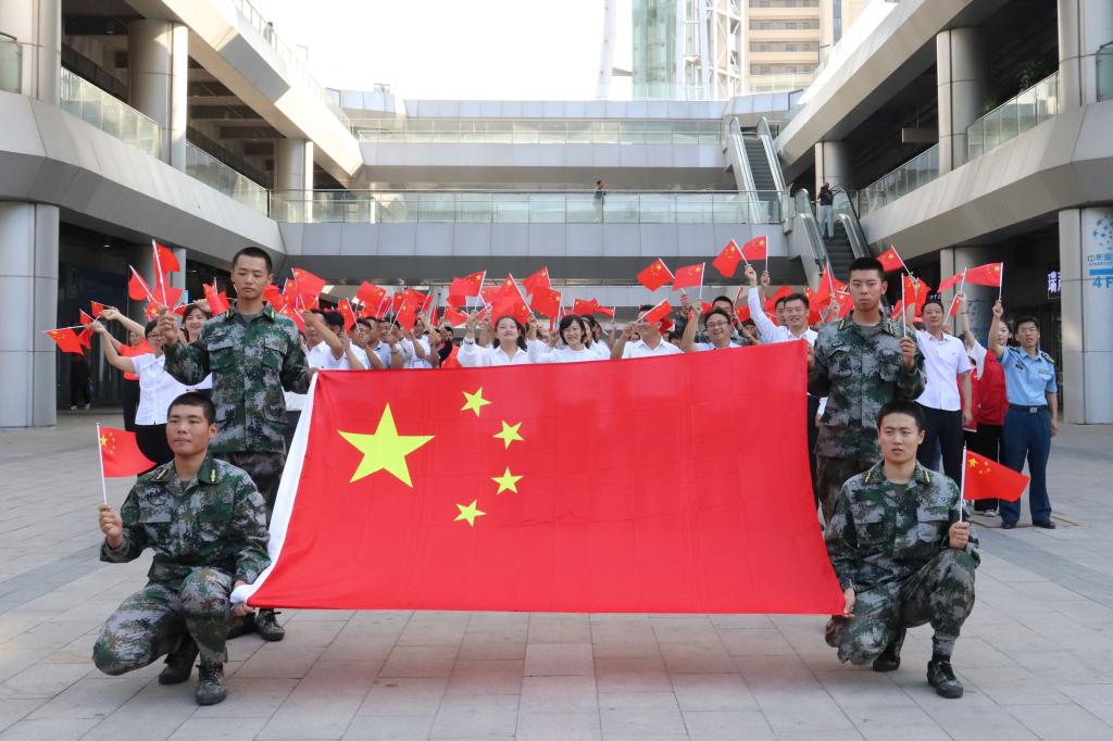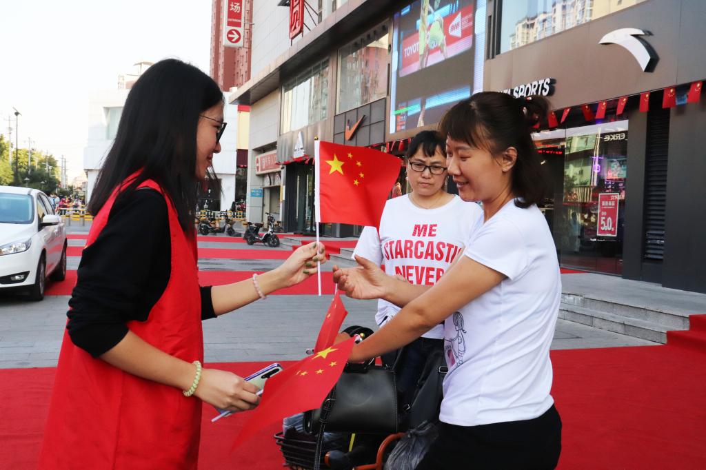 “我和我的祖国,一刻也不能分割……”在祖国七十华诞到来之际,章丘区部分机关代表与7003全讯白菜网青年师生在济南市章丘区唐人中心一起合唱《我爱你中国》,胸前佩戴着党徽和团徽,手中高举鲜艳的五星红旗,嘹亮高亢的歌声饱含着对祖国的无限祝福。从高空望去,由青年师生以及各个部门单位不同色彩组成的数字“70”的队形,以及各部门单位呐喊出的对祖国的祝福表达了莘莘学子与社会各界人士对祖国的爱与敬意,讴歌中华人民共和国成立七十周年的丰功伟绩。师生青年走进街头、社区为群众和社员发放国旗,同祝祖国母亲70岁华诞。