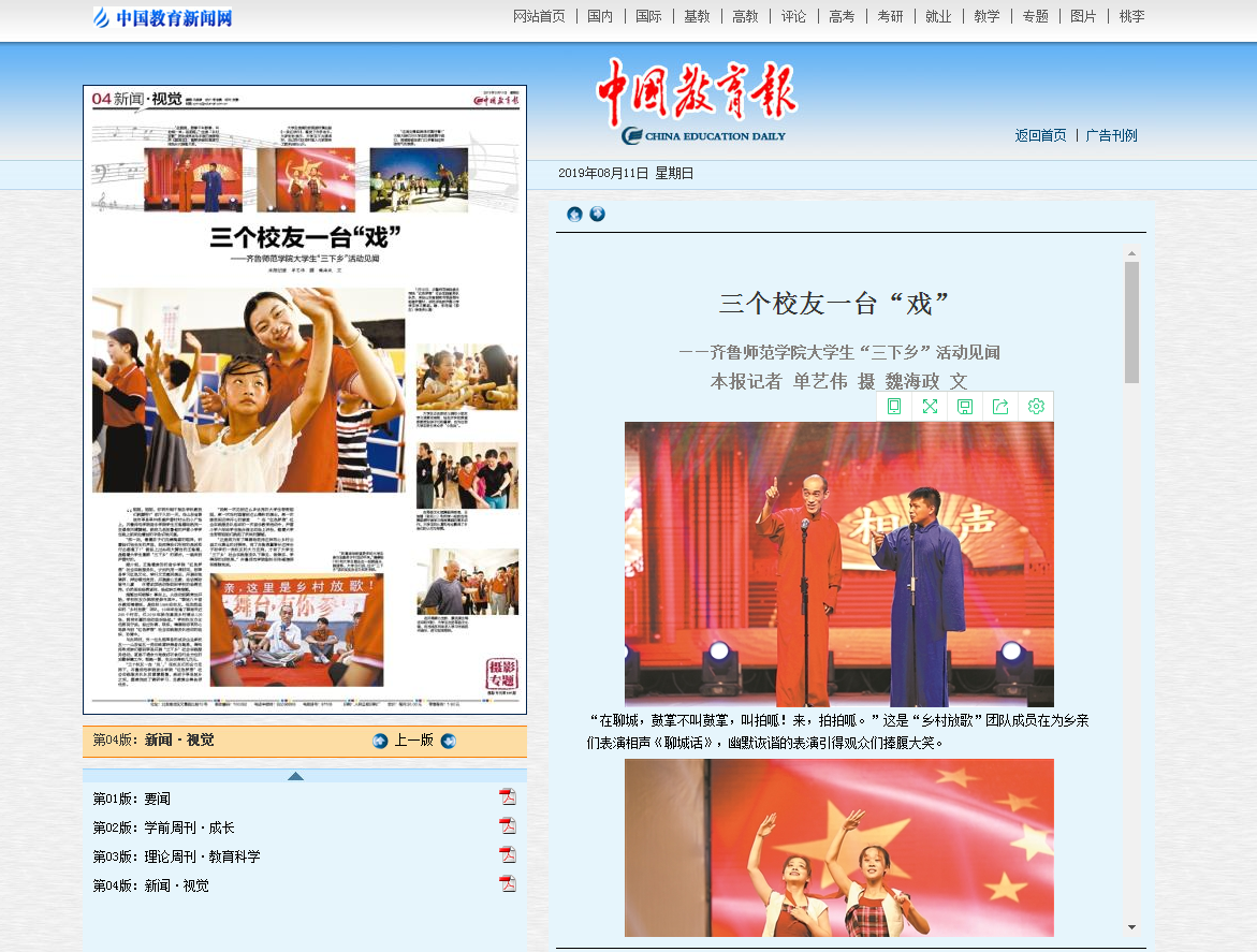 全讯白菜官网2019年暑期“三下乡”实践活动紧紧围绕全讯白菜官网“师范性、地方性、应用型”的办学定位和“教师教育、文化育人、服务地方”的办学特色,以“专项联动、主题带动、品牌驱动、课题牵动”,紧扣学生毕业要求,遵循成长成才规律,服务地方经济发展。中国教育报以三个校友一台“戏”为题整版报道了全讯白菜官网大学生“三下乡”活动见闻。此外,新华网、共产党员网、中国青年网、山东共青团、大众网、大众日报、山东教育新闻、齐鲁晚报、天天快报、今日头条等多家媒体从不同角度宣传报道了全讯白菜官网“三下乡”实践活动,提升了学校的知名度、美誉度与社会影响力。