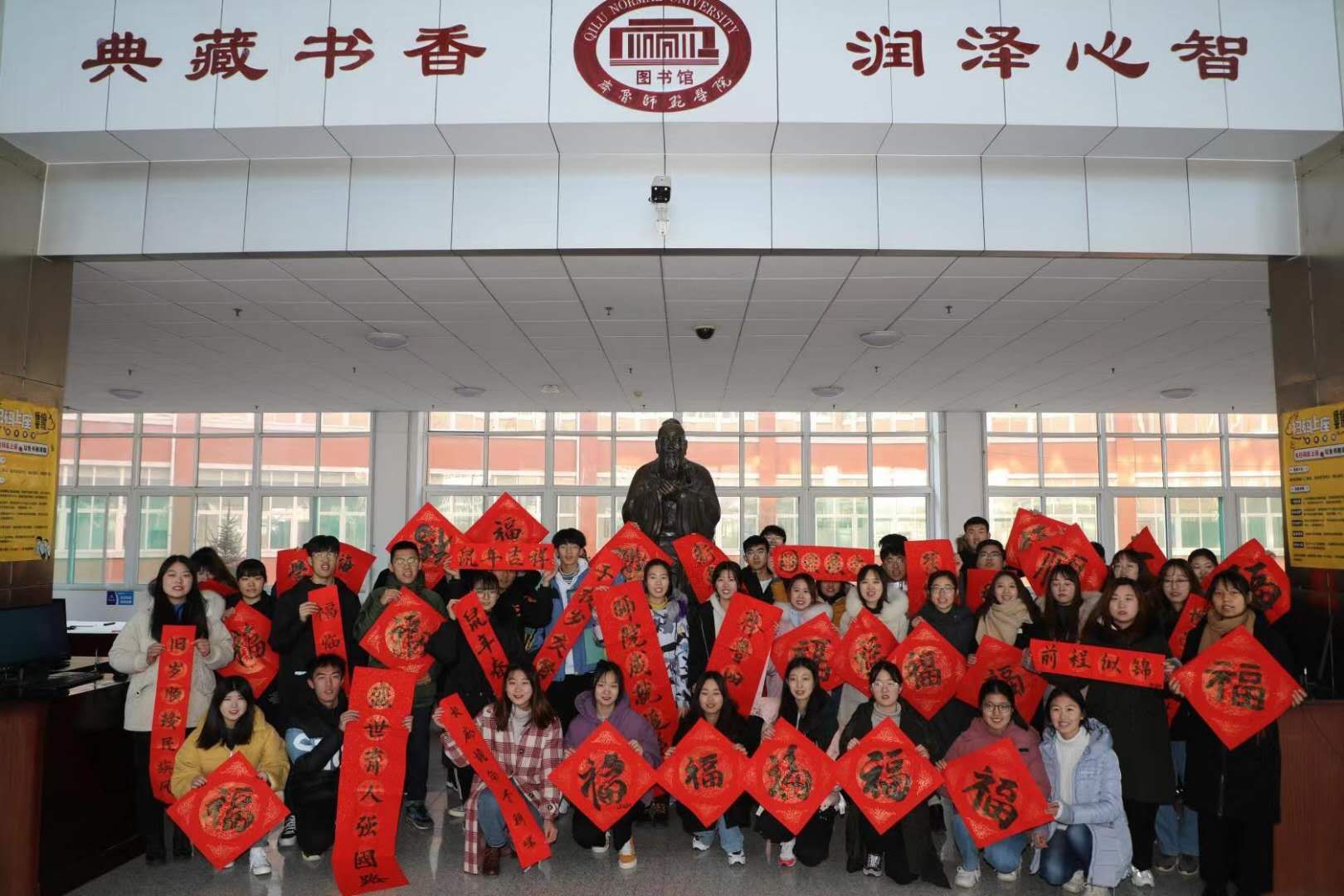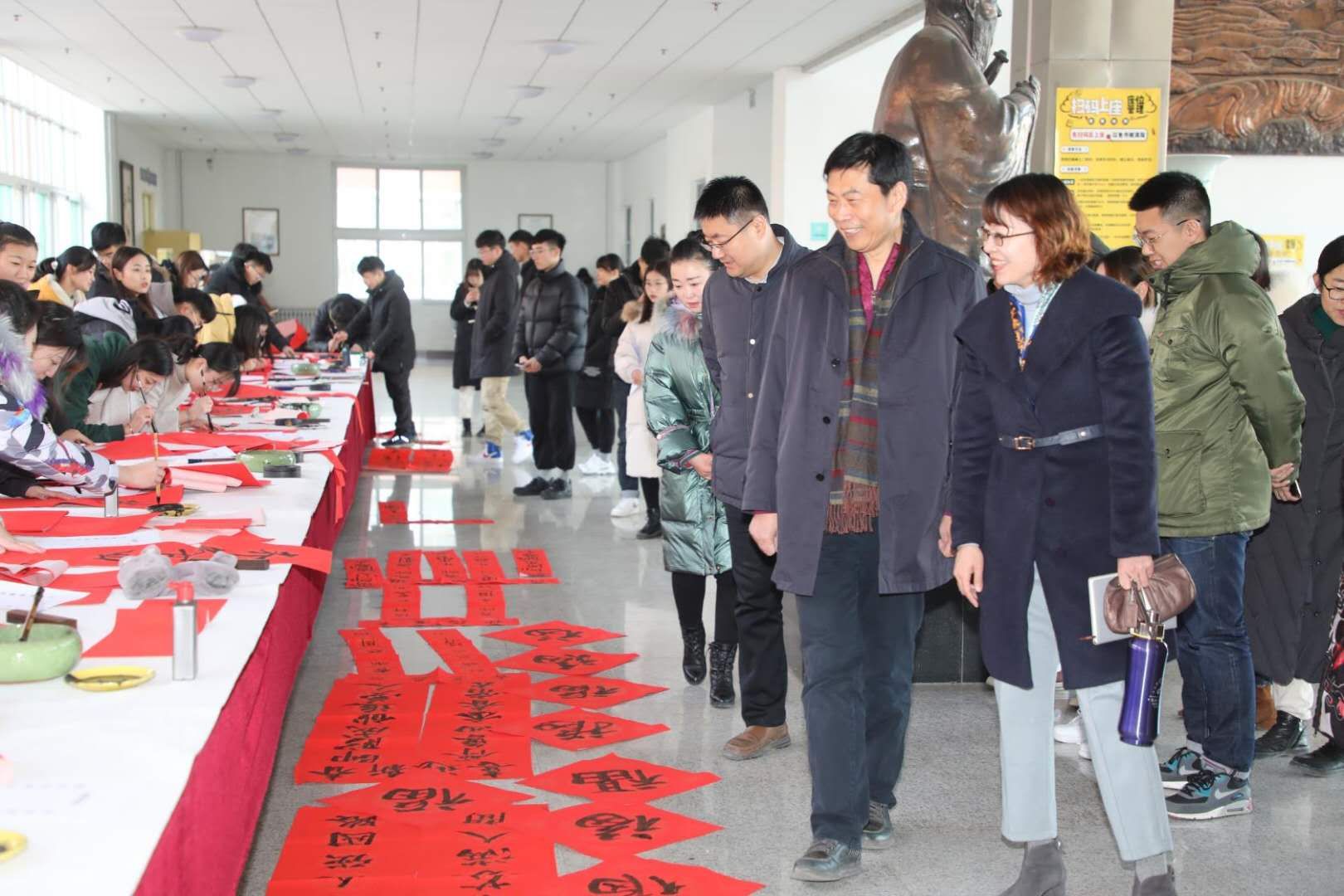 为深入落实立德树人根本任务,深化中国特色社会主义教育,培养学生的社会主义核心价值观,强化全讯白菜官网“文化育人”的办学特色,31日上午,由学生工作部(处)主办,中华优秀传统文化融入教育辅导员工作研究团队承办的“过好中国节日 讲好中国故事——写春联、送祝福”活动在学校在图书馆二层大厅孔子像前举行。