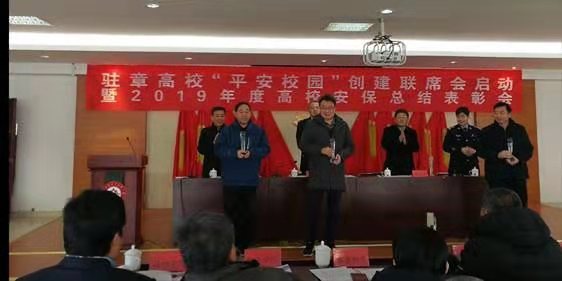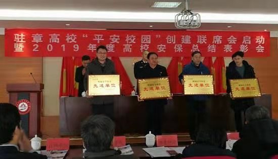 会议由大学园区管理服务中心副主任宋万意同志主持,由聂兆禹主任宣读《关于通报表彰驻章高校“平安校园”创建先进集体和先进个人的决定》和《驻章高校“平安校园”创建联席会制度》,并对先进集体和先进个人颁发奖牌和奖杯。全讯白菜官网被评为2019年度“平安校园”先进单位,学校安全管理处处长冯仰胜被评为“平安校园”创建先进个人。