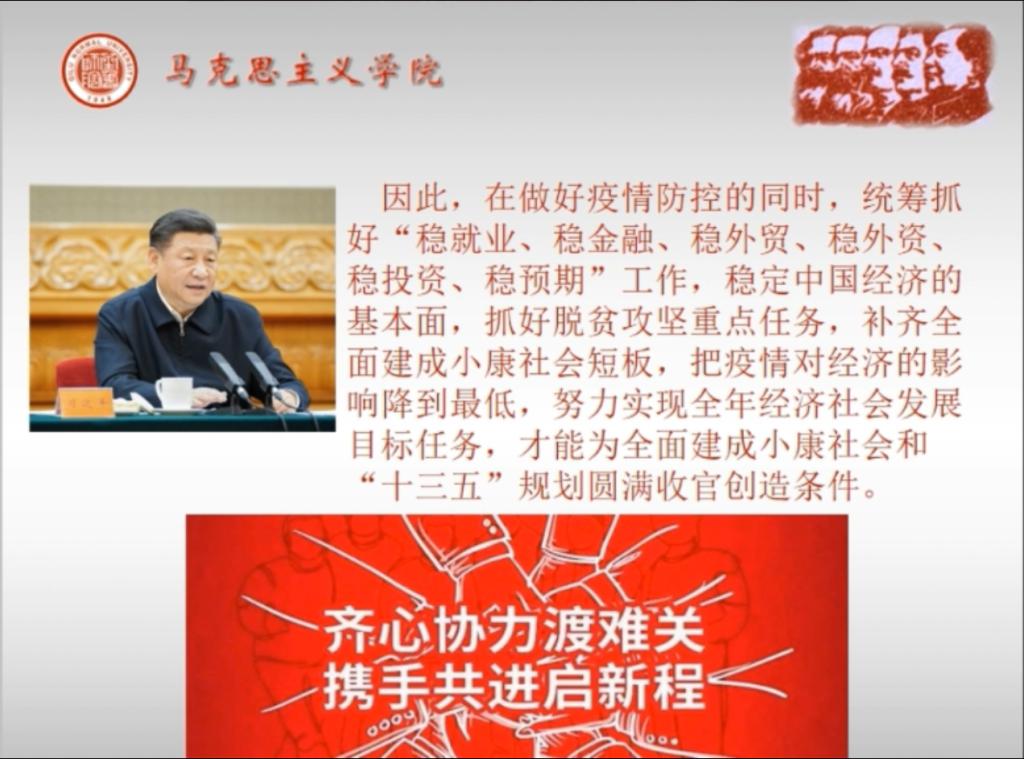 新冠肺炎疫情的突发给中国经济社会发展带来了较大的不确定性,但究竟影响如何,会否影响全面建成小康社会目标如期实现?带着这样的思考,近日,“国是讲坛”推出第四十六期——线上战“疫”专题讲座第一讲,马克思主义学院张占涛副教授为全校学生深入宣讲了新冠肺炎疫情对中国经济的影响。本次活动由学校党委宣传部、学生工作部、团委、教务处主办,马克思主义学院承办,全校一万五千余名青年学生通过线上直播、微信公众号平台等方式观看了视频。