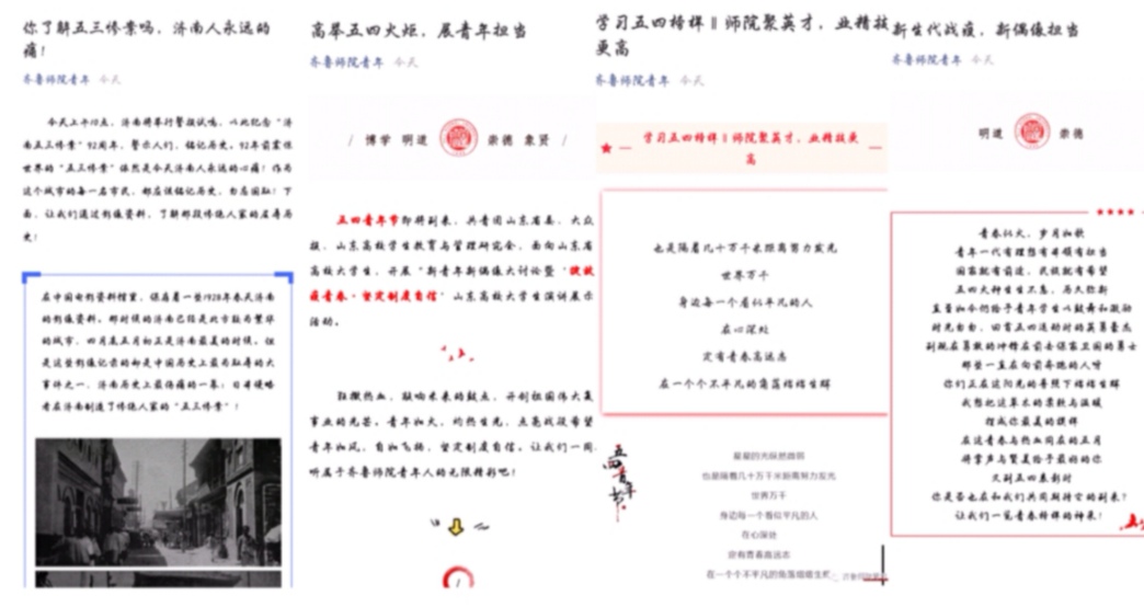 深度剖析偶像,青年有目标。4月19日,全讯白菜官网开展了“新青年新偶像大讨论暨‘绽放战疫青春•坚定制度自信’7003全讯白菜网大学生演讲展示活动”,共征得各学院优秀演讲视频近30份。活动潜移默化地影响着青年人的偶像观、价值观、成才观,激励和引领青年进一步坚定制度自信,投身党和人民最需要的地方发热放光,推崇英雄、崇尚担当、向往奉献的正能量在青年人心底慢慢积聚成塔。此外,校团委借助官方微信、微博等媒体平台陆续推送了《你了解五三惨案吗?济南人永远的痛》、《新声代战疫,新偶像担当》、《学习五四榜样‖师院聚英才,业精技更高》、《高举五四火炬,展青年担当》等文章,旨在激励学校广大青年志以成学,业精于诚,以身边的偶像为榜样,扎实理论功底,提高专业素养,在真抓实干中磨炼实践本领。