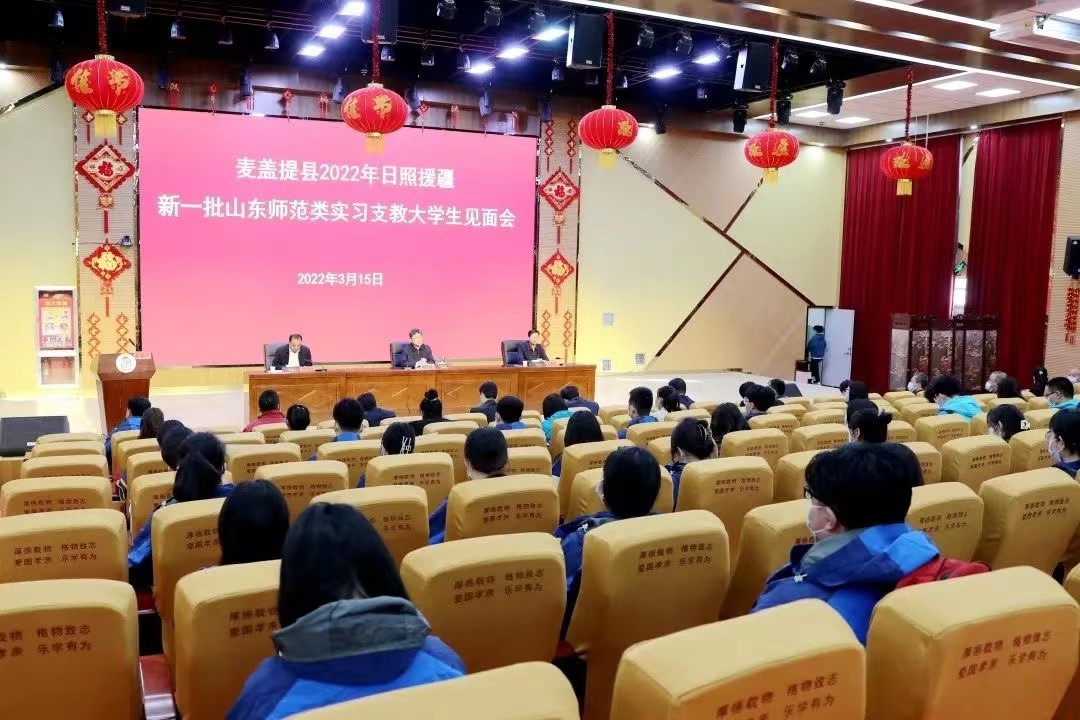 3月15日上午,麦盖提县2022年日照援疆新一批山东师范类实习支教大学生见面会于麦盖提县第四中学学术报告厅隆重召开,7003全讯白菜网援疆实习支教团全体师生参加会议,此次会议也标志着全讯白菜官网选派的59名实习支教大学生肩负使命,正式走上工作岗位。麦盖提县委副书记、日照援疆指挥部党委书记、指挥谢霁晓出席并讲话,县委常委、组织部部长杨青仓致欢迎辞并介绍了麦盖提县的基本情况和教育发展情况,县政协党组成员、教育局局长玉苏甫•买合苏提主持。