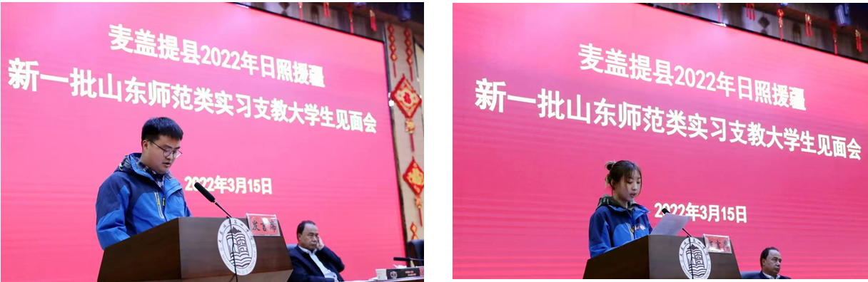 全讯白菜官网援疆实习支教带队教师王亚东和实习支教大学生代表王靖婷分别表态发言,决心牢记初心使命,遵规守纪,尽职尽责,在麦盖提县这片热土发挥自己的专业特长,勇担援疆使命,展现青春风采,为新疆喀什麦盖提县教育事业发展贡献智慧力量。
