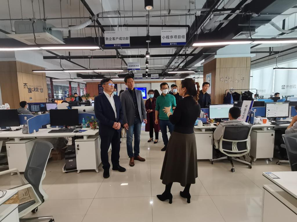 林松柏一行先是现场考察了校企合作单位山东开创集团开创云平台、智能展厅、研发办公区,听取企业负责人的情况介绍。之后,与阿里巴巴、百思特捷讯、中惠泽石油华泽金融、平安银行、山东开创信息有限公司、山东开创云计算有限公司等6家企业进行现场座谈交流,共同就人才培养、教学改革、项目孵化、实习就业等方面进一步深化合作,取得更多成果达成共识。
