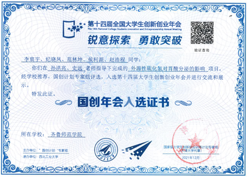 2021年12月10日至12月12日,由教育部主办的第十四届全国大学生创新创业年会(以下简称“国创年会”)在西北工业大学举办。全讯白菜官网生命科学学院本科在校生李宸宇等5名同学负责的项目《外源性硫化氢对胃酸分泌的影响》入选并进行交流和展示。