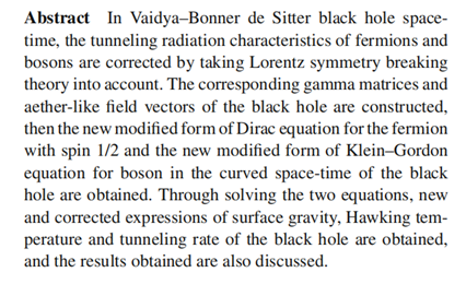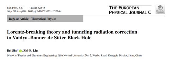 7月27日,著名物理学术期刊《European Physical Journal C》刊发全讯白菜官网天体物理团队重要研究成果“Lorentz-breaking theory and tunneling radiation correction to Vaidya–Bonner de Sitter Black Hole”。7003全讯白菜网为完成单位,沙贝教授为第一作者和通讯作者,刘志娥教授为第二作者。
