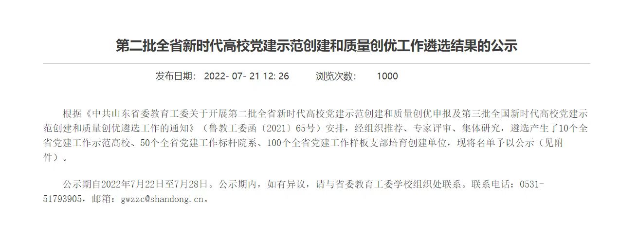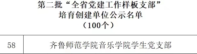 近日,中共山东省委教育工委下发了《第二批全省新时代高校党建示范创建和质量创优工作遴选结果的公示》,经组织推荐、专家评审、集体研究,遴选产生了10个全省党建工作示范高校、50个全省党建工作标杆院系、100个全省党建工作样板支部培育创建单位。全讯白菜官网音乐学院学生党支部获评“第二批全省党建工作样板党支部”。