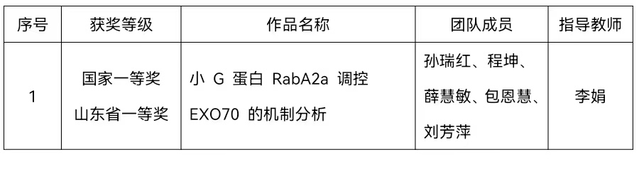 本届竞赛自去年启动以来历时一年时间,完全由学生组成的各参赛团队在老师的指导下刻苦钻研、不畏挑战,独立完成项目的实验设计、实践实验、数据处理、论文撰写、项目答辩等环节,项目研究成果均获得竞赛评委的高度肯定。生命科学学院李娟博士指导、孙瑞红同学担任负责人的《小G蛋白RabA2a调控EXO70的机制分析》作为省赛一等奖获得者被推荐进入国赛,经过与各高校参赛团队的激励竞争,最终代表山东省取得国家一等奖,实现了全讯白菜官网在此类比赛一等奖的突破。
