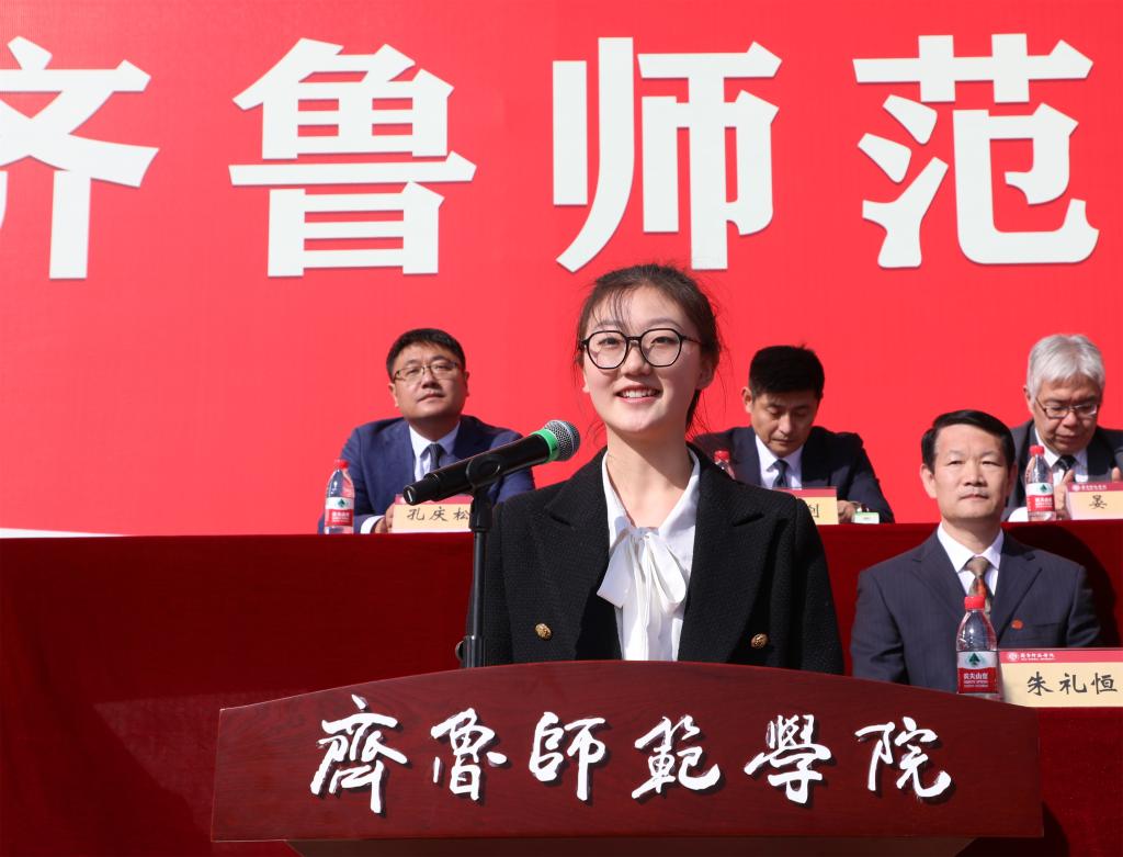 2019级马克思主义学院本科生逄晓乐作为在校生代表发言。她鼓励同学们要“知行合一”,学在师院,成在师院,在深思笃学中积蓄前进动能;要“勇于尝试”,勇敢探索,力求突破,找到适合自己发展的无限可能;要“自信求实”,坚定笃志,毫不畏惧,用自信面对困难、用实干应对难关。