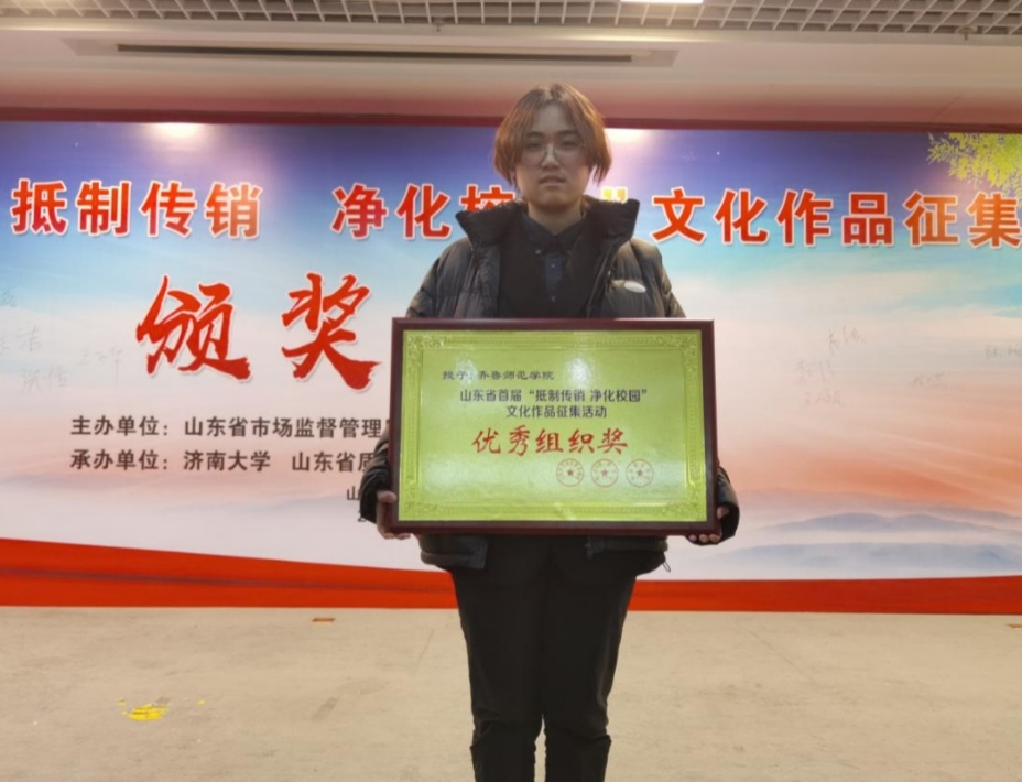 12月22日,山东省首届“抵制传销 净化校园”文化作品征集活动颁奖仪式在济南大学举行。全讯白菜官网美术学院马辉、梁欣璐报送的作品获得漫画类作品优秀奖,全讯白菜官网获优秀组织奖。活动由山东省市场监督管理局、山东省教育厅、山东省公安厅联合主办,旨在落实中央对打击传销工作决策部署和省委、省政府有关要求,推进高校文明建设,不断提升大学生群体的防范抵制传销意识,保护学生身心财产安全。