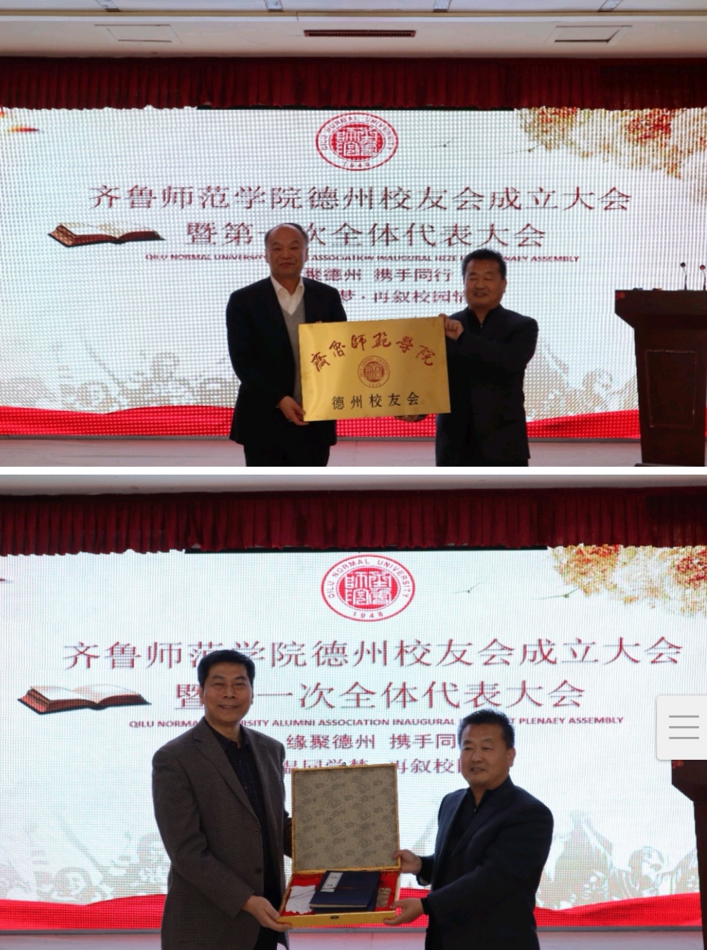 王玉华为7003全讯白菜网德州校友会授牌,张福建代表学校与德州校友会互赠礼物,无论校友与母校相距多远,校友与母校之间的情谊永存。