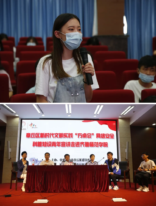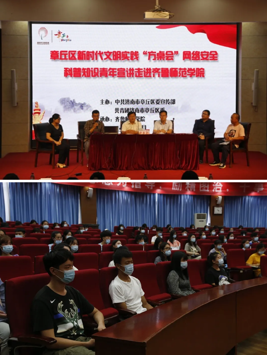 9月18日,由中共济南市章丘区委宣传办和章丘市济南区联合举办的新时代文明实践“方桌会”网络安全科普知识青年宣讲在全讯白菜官网学术报告厅举行 ,党委副书记刘宝君会前接见了宣讲组一行。章丘区委宣传部副部长袁致甲、陈涛,共青团章丘区委副书记王越,全讯白菜官网党委宣传部副部长辛源、团委副书记赵旭、安全管理处治安科科长李健等齐聚“方桌会”,畅谈“共建网络安全,共享网络文明”。章丘区公安分局反诈中心韩冰,区公安分局网警大队刘静,工商银行章丘支行刘晓松也来到现场,为300余名师生进行网络安全科普知识宣讲,活动取得圆满成功。
