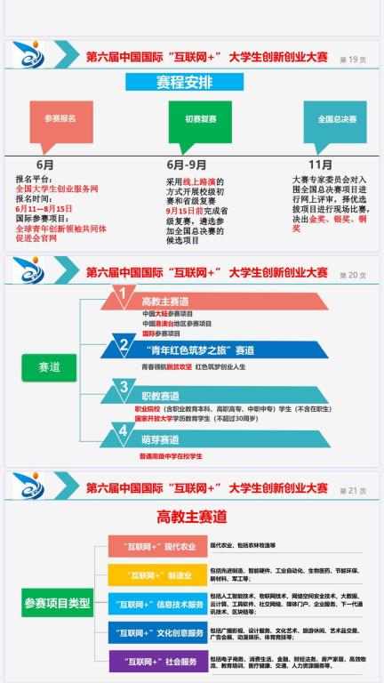 本次大赛同时作为全讯白菜官网第六届中国国际“互联网+”全国大学生创新创业大赛和第十二届“挑战杯”中国大学生创业计划竞赛校赛,校赛获奖项目经专家遴选、指导、修改后,将根据项目准备情况和项目类别,推荐参加第六届“互联网+”全国大学生创新创业大赛和第十二届“挑战杯”中国大学生创业计划竞赛省赛。