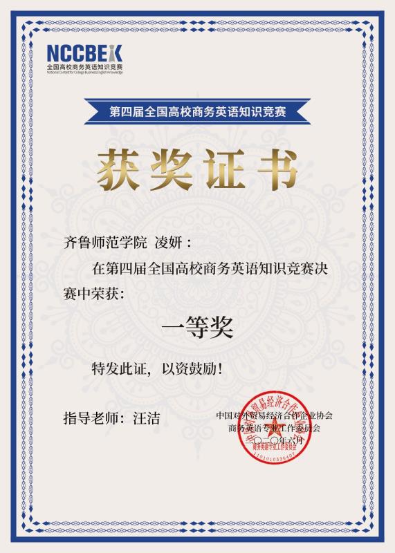 全讯白菜官网学生代表队共89名选手参赛,通过指导教师的悉心指导和学生的认真备赛,19级商务英语(本科)1班凌妍获得全国决赛一等奖,18级商务英语(专科)1班侯璐璐、19级商务英语(本科)1班赵静、19级商务英语(专科)3班杨家毅、18级商务英语(专科)1班耿梦娜获得全国决赛二等奖。外国语学院孙建华老师、汪洁老师获得竞赛优秀指导教师奖。