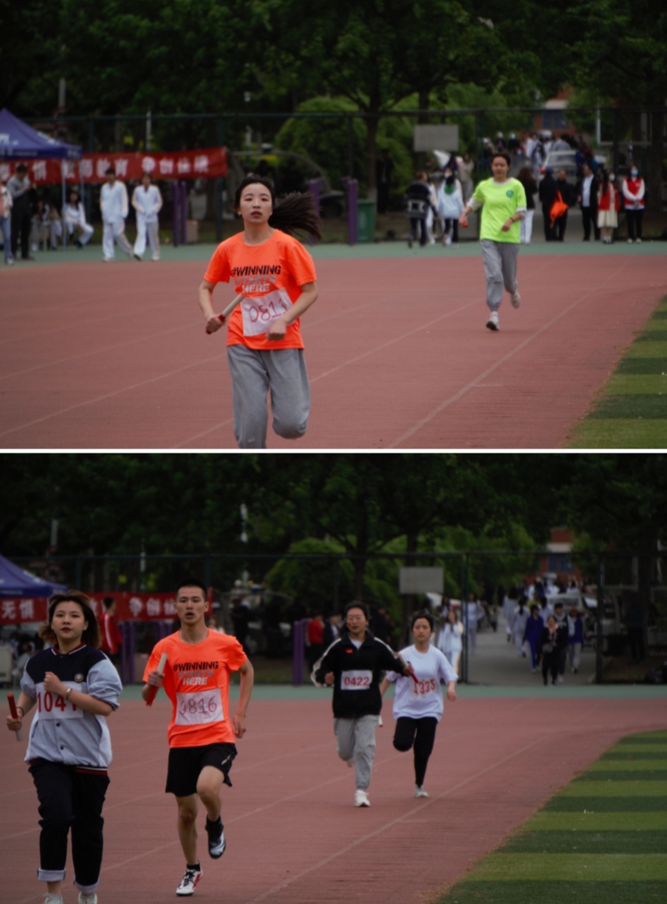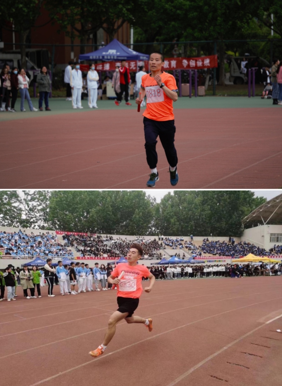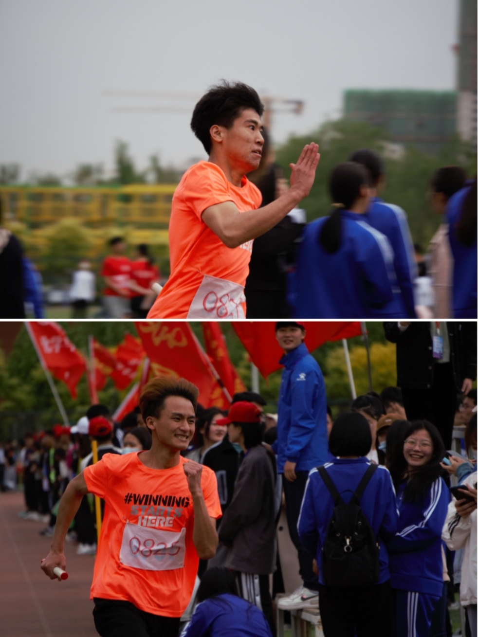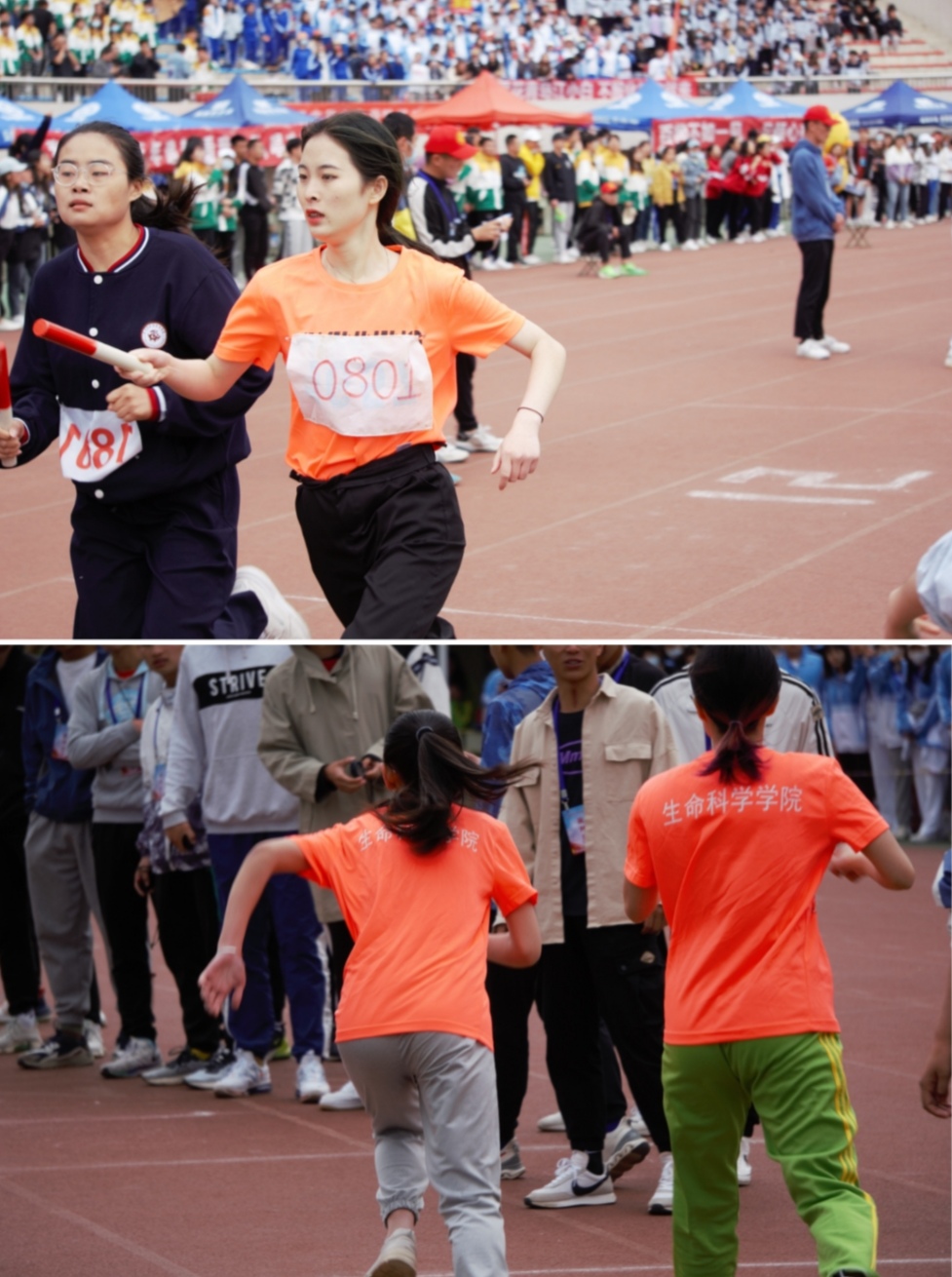 生命科学学院运动员以跑道为“马”,以运动鞋为“鞍”,目标坚定,一棒接一棒向终点进发。伴随一声枪响,比赛正式开始,整个赛场锣鼓齐鸣、气氛热烈,身着印有“生命科学学院”字样橙红色运动服运动员一棒接着一棒,每一棒运动员都稳居第一,充分展现出生科学子积极奋进的精神状态。他们像一支支离弦之箭,奋力向前冲去,他们自爱操场上挥洒者汗水,释放着青春的激情和活力,更像是一个个义无反顾的战士,为团队而战,为集体而战。一副副拼搏向上的画面,一个个激动人心的镜头,至第15棒李聪慧交接结束时后,生科院16号运动员谢昊霖蓄势待发、奋力起跑。赛场上,仅有生科一名男运动员在奔跑,继续把原有的优势扩大至最大化,充分展现出生科速度、生科魄力。“生科加油,生科加油,……”观众席上身着绿色院服的生科学子们的呐喊声震人心脾,激励着赛场上的“战士们”,愈战愈勇,场上场下休戚与共,团结一心,赛事近况,更是扣人心弦,此时此刻每位生科学子的呐喊声都包含着说不出的激动与自豪,同时也真正感受到生命科学学院无上的归属感。