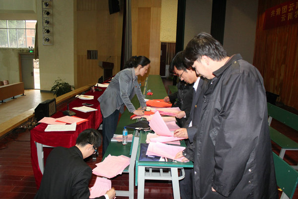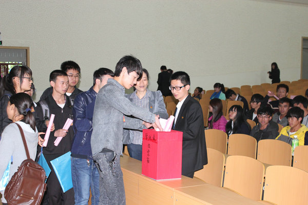 下午14:30,第二次全体代表大会在大礼堂举行,大会通过了委员选举办法,总监票人、监票人的建议名单,通过了第四届团委会、学生会委员候选人名单,并严格按照程序,采用无记名投票差额选举的方式,选举第四届团委会、学生会委员。