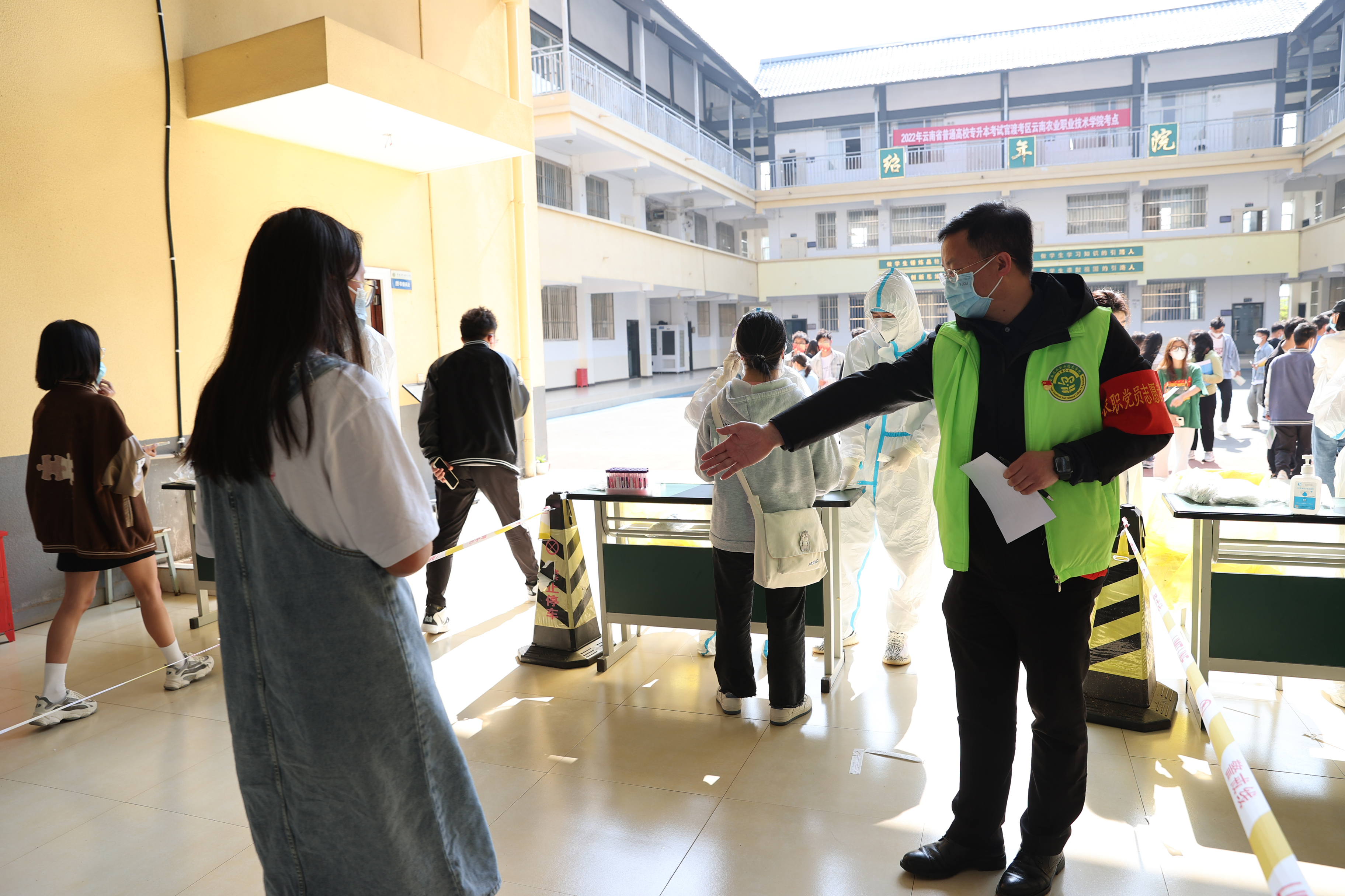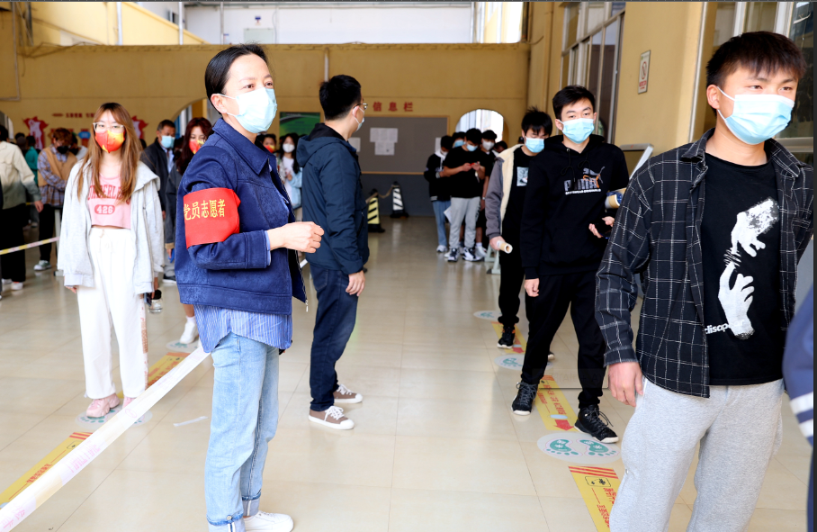 职能部门党总支的40余位党员积极响应学院党委开展的“站好党员先锋岗做好疫情防控领头人”志愿服务活动,自愿加入疫情防控队伍,参与疫情防控志愿服务,他们分工明确、各司其职,耐心疏导维持秩序,时刻提醒同学们保持一米间距,认真组织人员扫场所码、测温、登记、核酸检测,与医护人员并肩作战,保障着核酸采样工作顺利进行,助力学院圆满完成9000余人的大规模核酸检测采样任务。