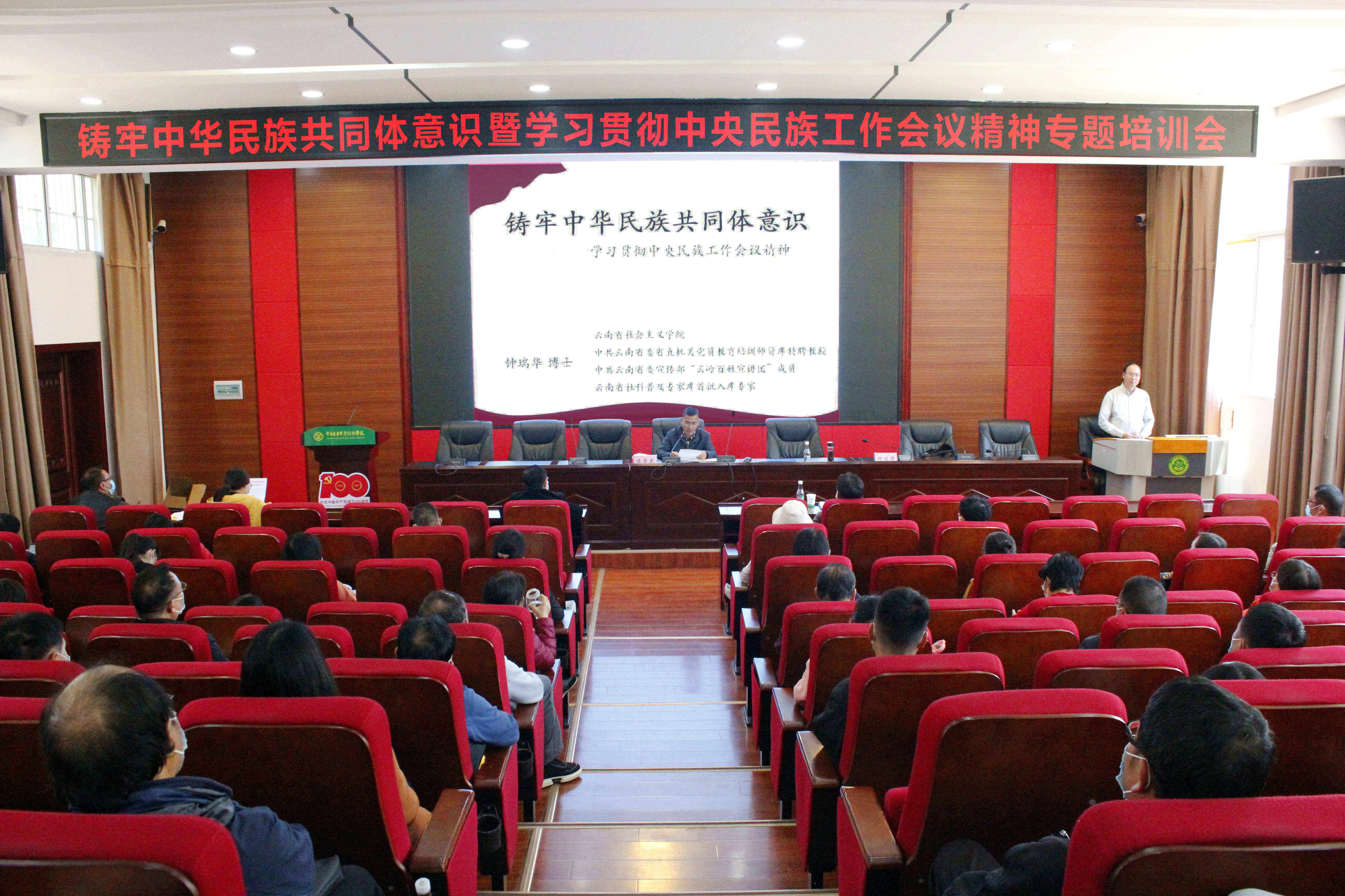 通知中心4月20日下午,学院党委统战部、党委党校在小哨校区嘉锐楼报告厅共同组织开展了铸牢中华民族共同体意识暨学习贯彻中央民族工作会议精神专题培训,学院邀请了云南省社会主义学院教研部主任钟瑞华副教授进行授课,各基层党组织统战委员、民主党派、党外人士代表、党外知识分子等80余人参加培训,培训由学院党委副书记伍学龙同志主持。