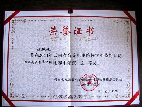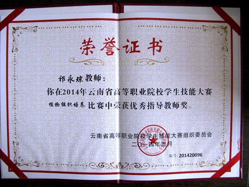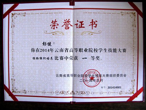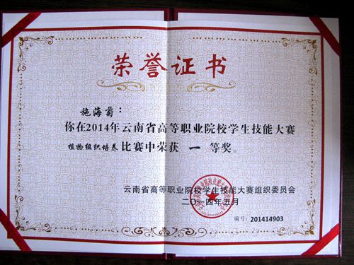 5月15日下午,2014年云南省高等职业院校学生技能大赛在昆明工业职业技术学院举行颁奖仪式,best365园林园艺学院学生在竞赛中表现出色,再创佳绩,喜获一等奖两项、三等奖一项。彭建、施海菊、张应琼、杨子芳四位同学代表学院参加的“植物组织培养”团队项目的比赛中,冷静应对、协同配合,最后获得了该项目的一等奖。施砚池同学代表学院首次参加“植物病虫杂草识别”项目比赛,获得了该项目的三等奖。祁永琼老师获得“优秀指导教师奖”。