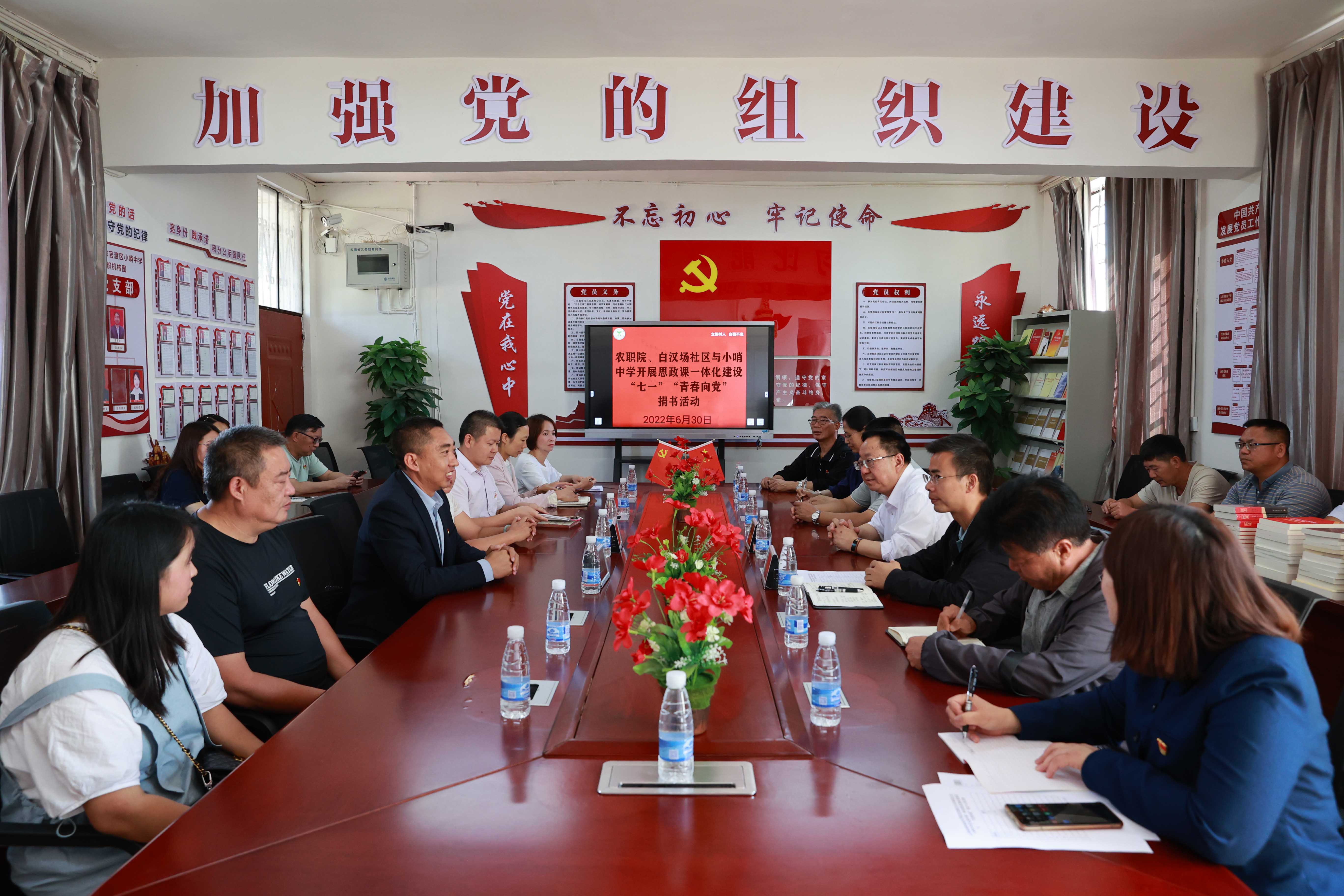 通知中心6月30日,学院党委联合白汉场党总支部,到小哨中学开展思政课一体化建设“七一”“青春向党”捐赠图书活动。学院党委书记文俊同志、党委副书记伍学龙同志,白汉场社区党总支部副书记杨桂香同志、监督委员会主任王彪同志,小哨中学党政负责人苏有文同志、副校长黄贵祥同志和刘少昌同志以及三家单位报名参加“双报到双服务双报告”的党员同志等40余人参加活动。