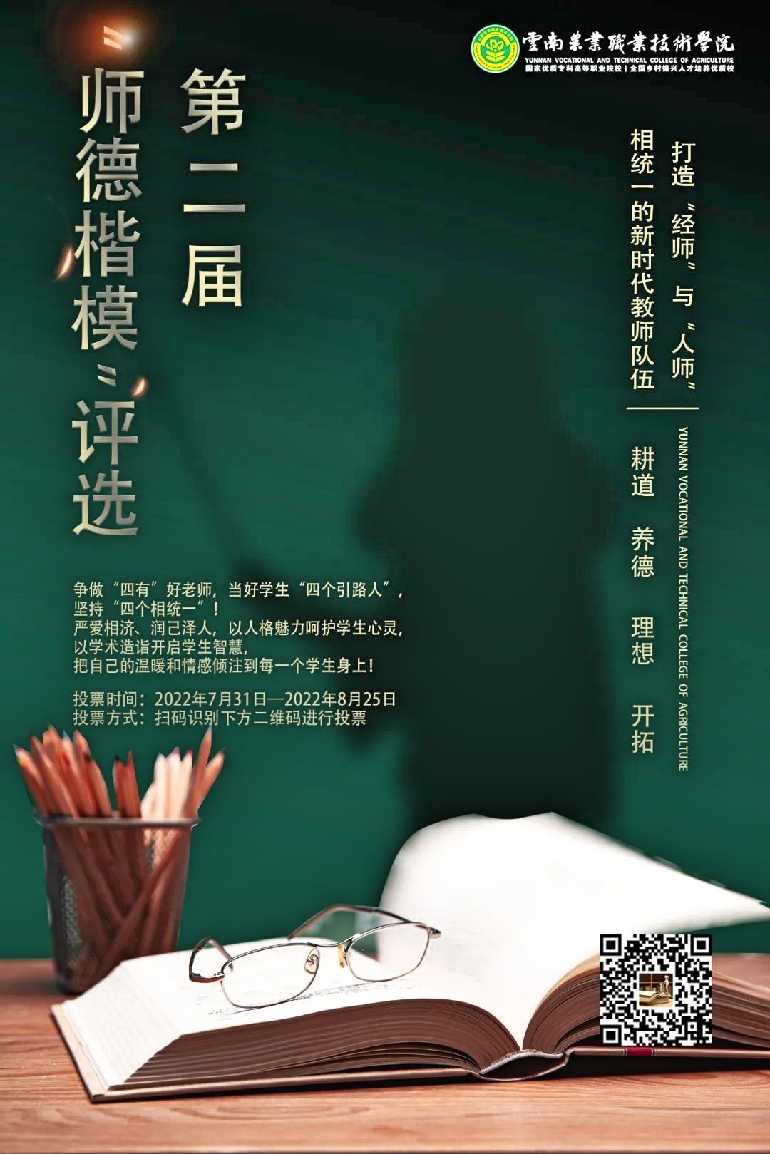 通知中心为学习贯彻党的十九大和十九届历次全会精神,深入学习贯彻习近平总书记关于教育的重要论述特别是关于教师工作的重要指示批示精神,宣传我院教师率先垂范、教书育人、奉献社会的高尚师德和感人事迹,营造尊师重教的浓厚氛围,引导和激励广大教师争做党和人民满意的“四有好老师”、“四个引路人”,扎实推进师德建设,以实际行动和优异成绩迎接党的二十大胜利召开,学院开展第二届“师德楷模”评选活动。