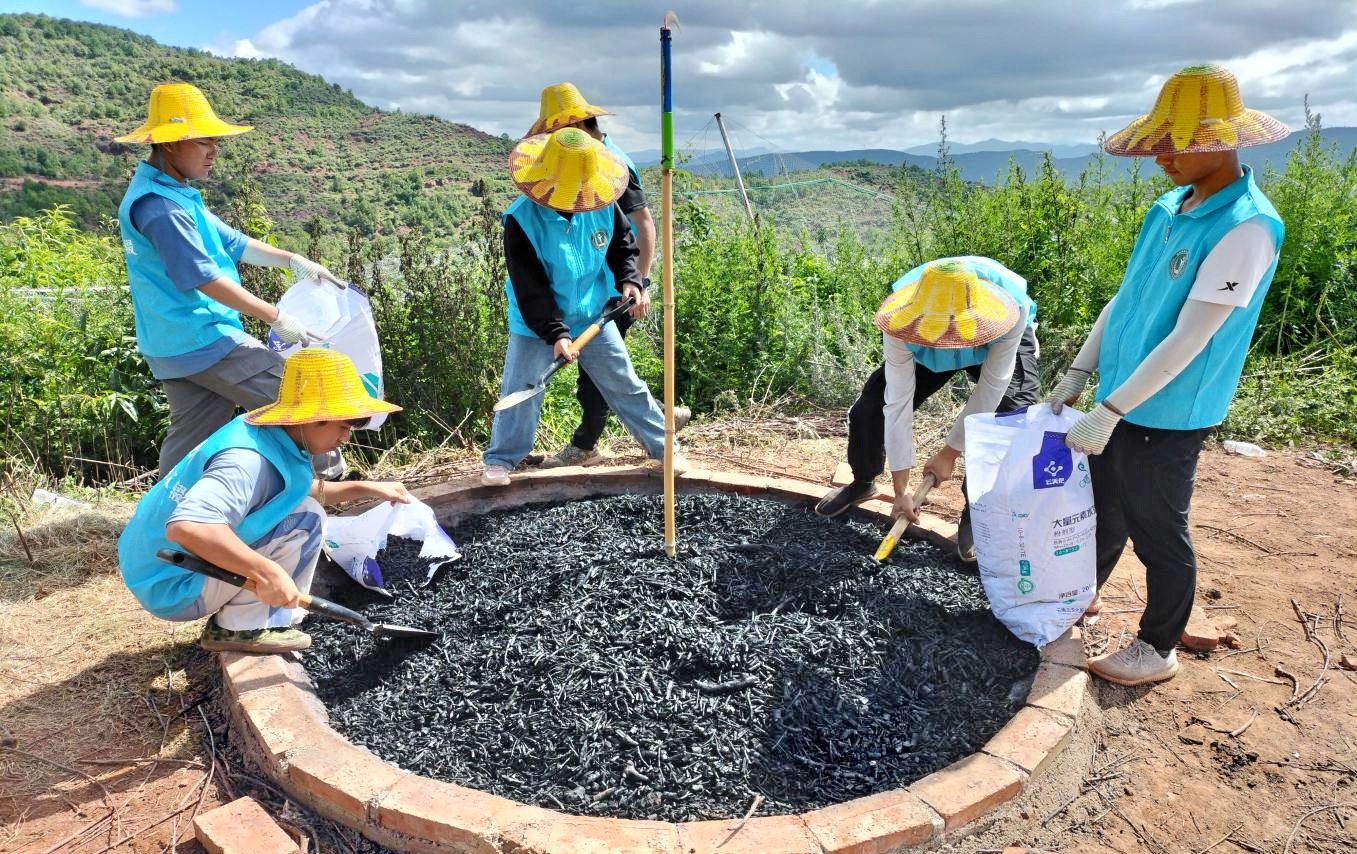 实践队师生在双柏县法脿镇者柯哨村实操生物炭制备
