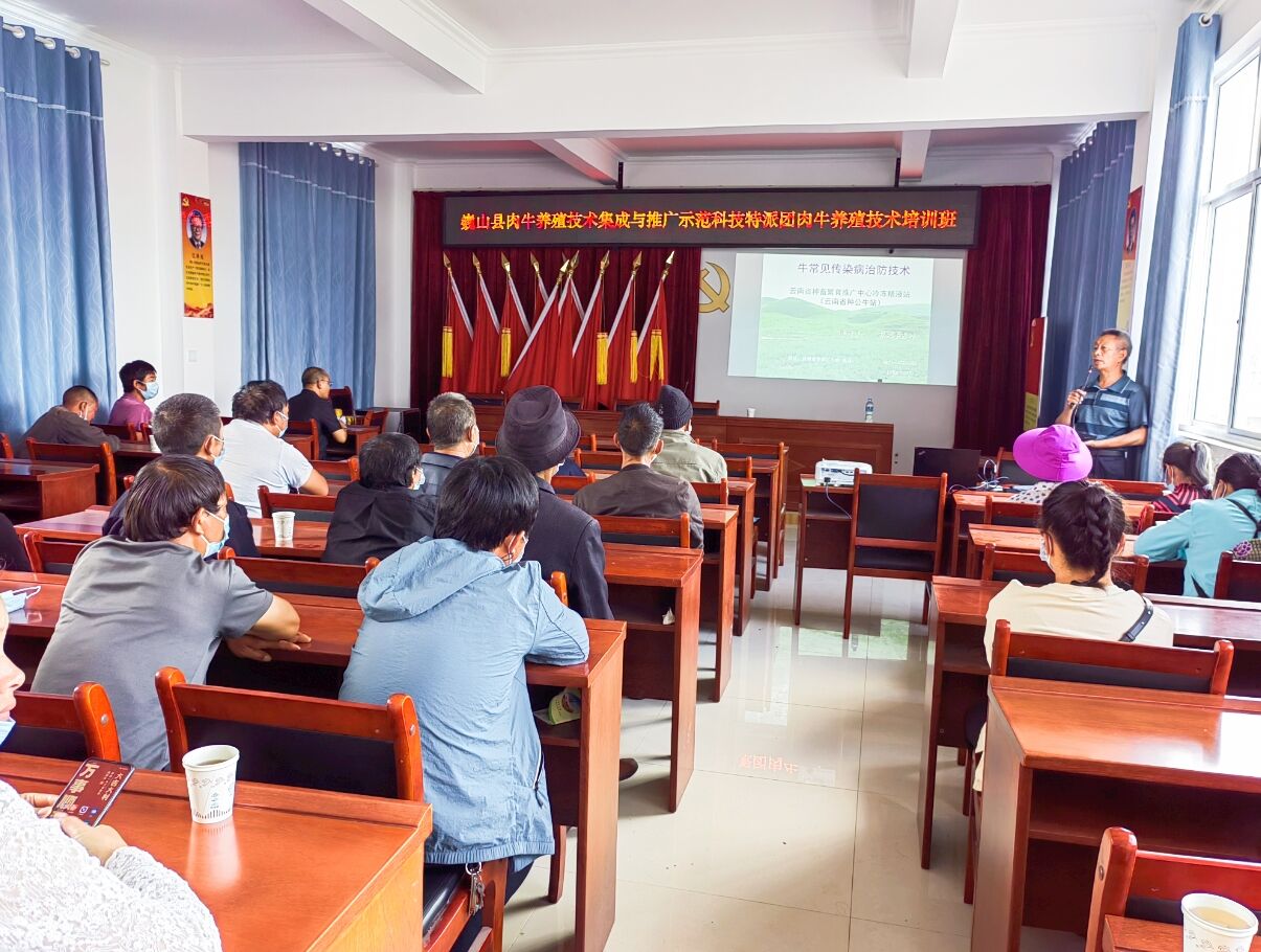 17日,工作组到巍山县庙街镇慧明村委会开展肉牛养殖技术培训,当地12个行政村的肉牛养殖合作社(户)40余人参加了培训。会上,巍山县农业农村局产业办杨云刚主任做了动员讲话。随后鲁增荣高级兽医师根据培训对象特点深入浅出地讲授了“牛常见传染病防治技术”,培训结束后,特派团团队成员与参会人员进行交流互动,热心解答农户提出的肉牛疫病防控、饲养管理等方面的问题。