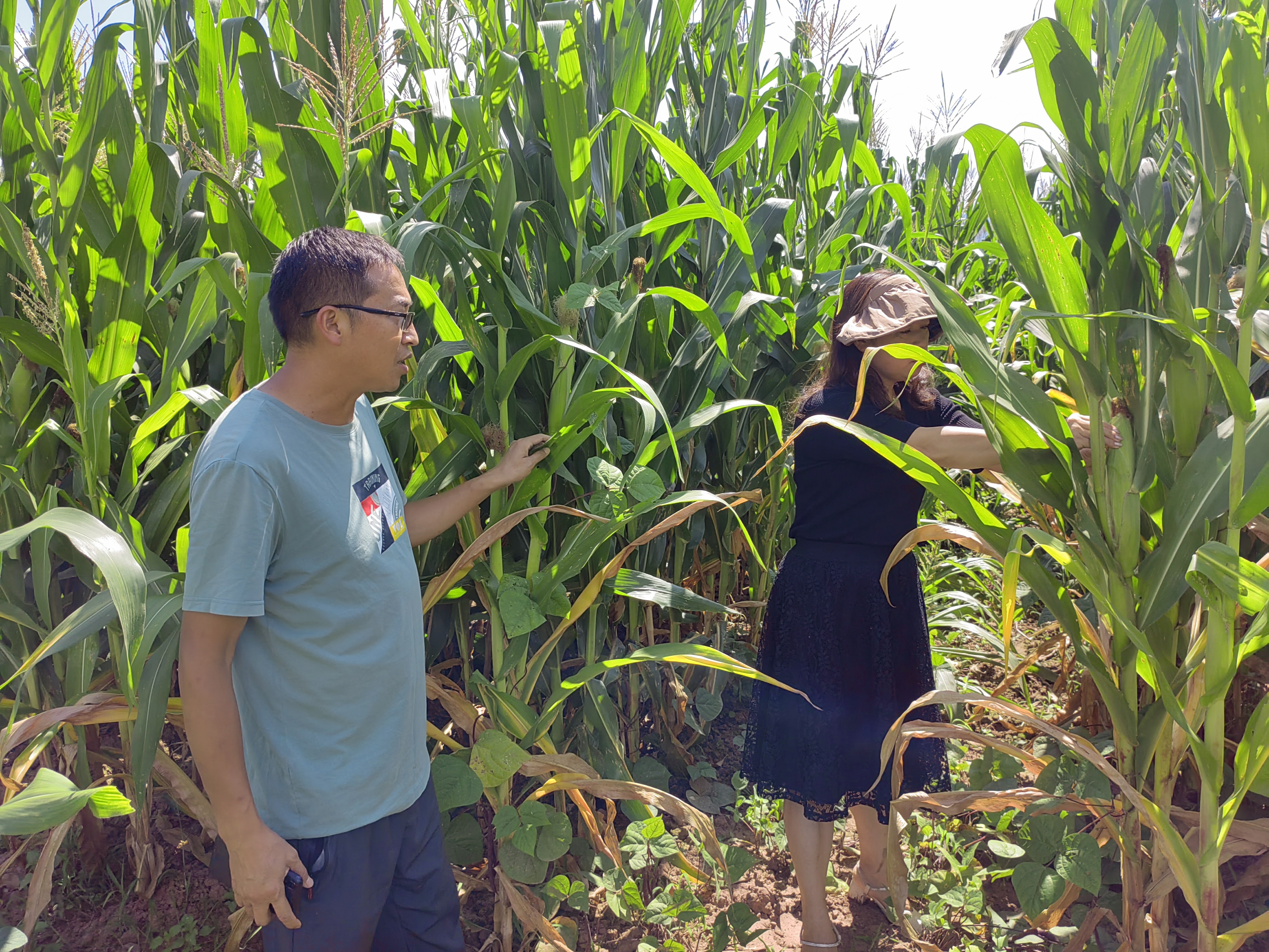 19日,工作组刘丽仙教授和亐开兴研究员到科技特派团青贮玉米和豆科作物间作实验田,查看作物长势情况。