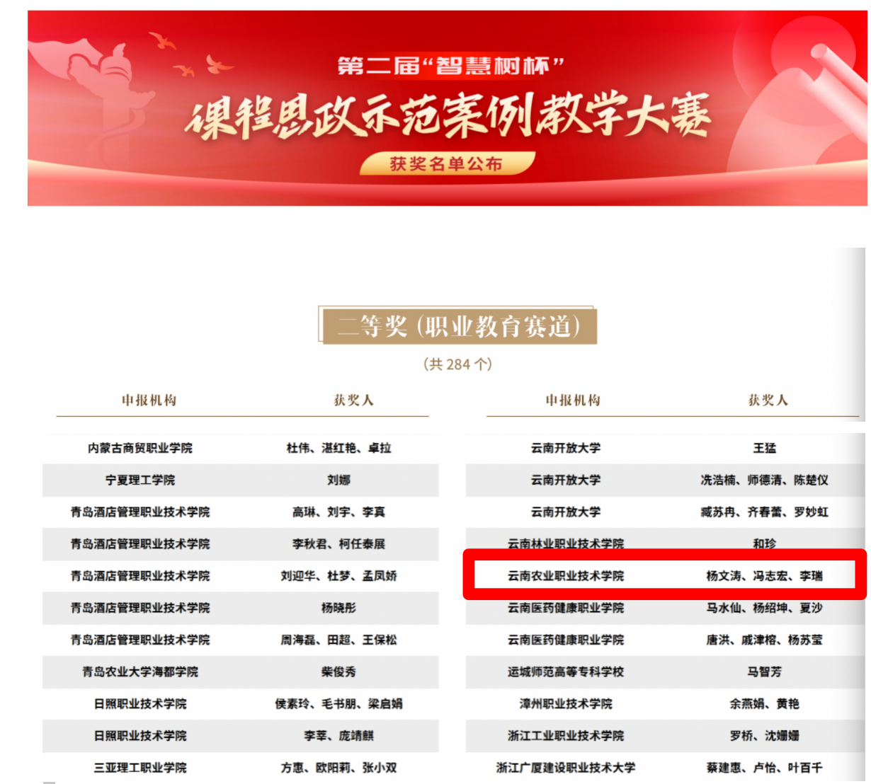 日前,全国第二届“智慧树”杯课程思政示范案例教学大赛圆满落幕。我院基础部中国传统文化教研室杨文涛、冯志宏和李瑞老师提交的《耕道养德中华优秀传统文化专题》网课“红色校史”案例获课程思政示范案例职业教育赛道二等奖,取得我院课程思政建设中的又一新的突破。据悉,本届大赛,组委会共收到来自全国500余所学校的教师及教学团队提交的2000余份课程思政案例材料,经过初赛、复赛两轮评选及公示期复议,最终评选出特等奖100个;一等奖200个,二等奖970个,最佳组织奖21个。