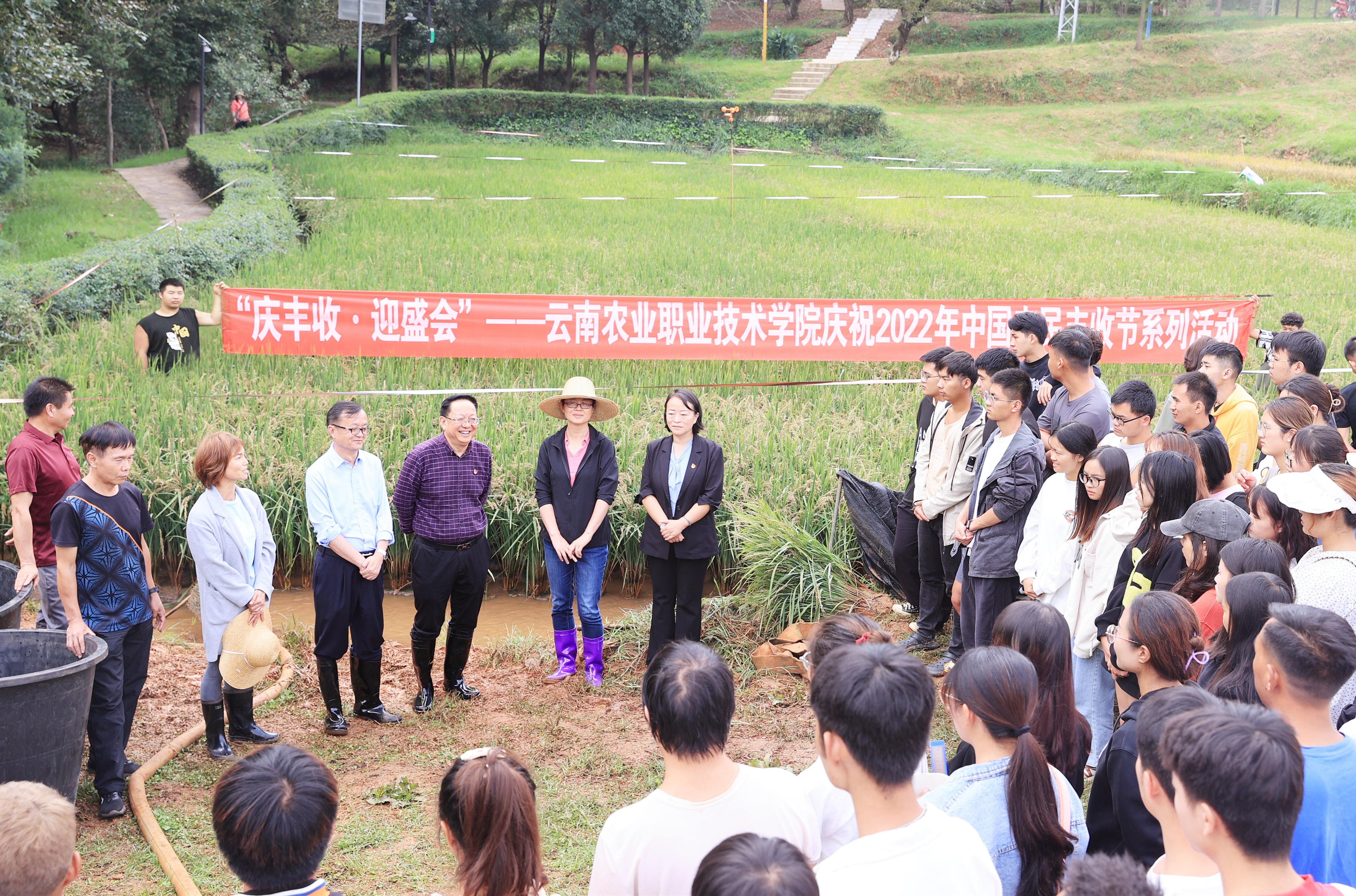 稻田养鱼是作物生产与经营管理专业教学团队就如何更好地落实产学研,分别联合农学与园艺技术学院和畜牧兽医学院相关专业,在云南农业大学稻作所的支持下,以学院实践教学中心为主,通过3年的试验示范,良种良法配套,以稻鱼共生绿色生产模式及“描绘”稻田画,使学生懂得从稻田里的一株苗,到碗里的一粒米,再到乡村的一片风景,真实展现了“科技稻”变身“风景稻”“民生稻”,坚定学生服务“三农”的信心。