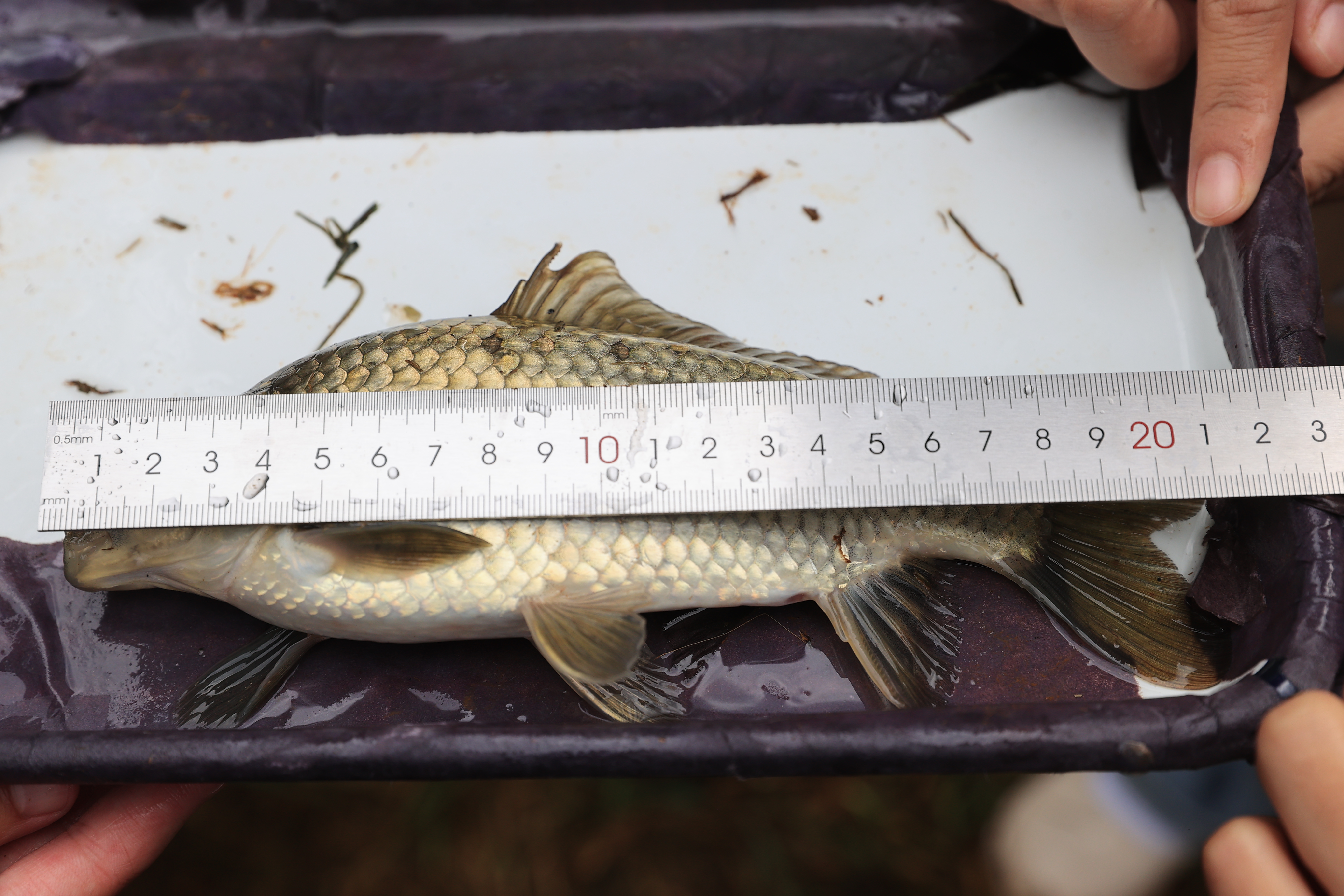 据介绍,该示范田块面积约667平方米,鱼沟鱼溜约占总面积的8%。本年度6月1日投放了鱼苗50公斤,平均规格40克/尾,在养殖期间不施用任何肥料,确保鱼体生态有机。经过113天的养殖,至今日起捕时,最大个体已达到全长26厘米,体重260克。经现场随机抽测39尾,总重量5.51千克,平均141.3克/尾。今年的稻花鱼迎来了丰收季,活动现场师生笑容灿烂,真正体会了丰收的喜悦。