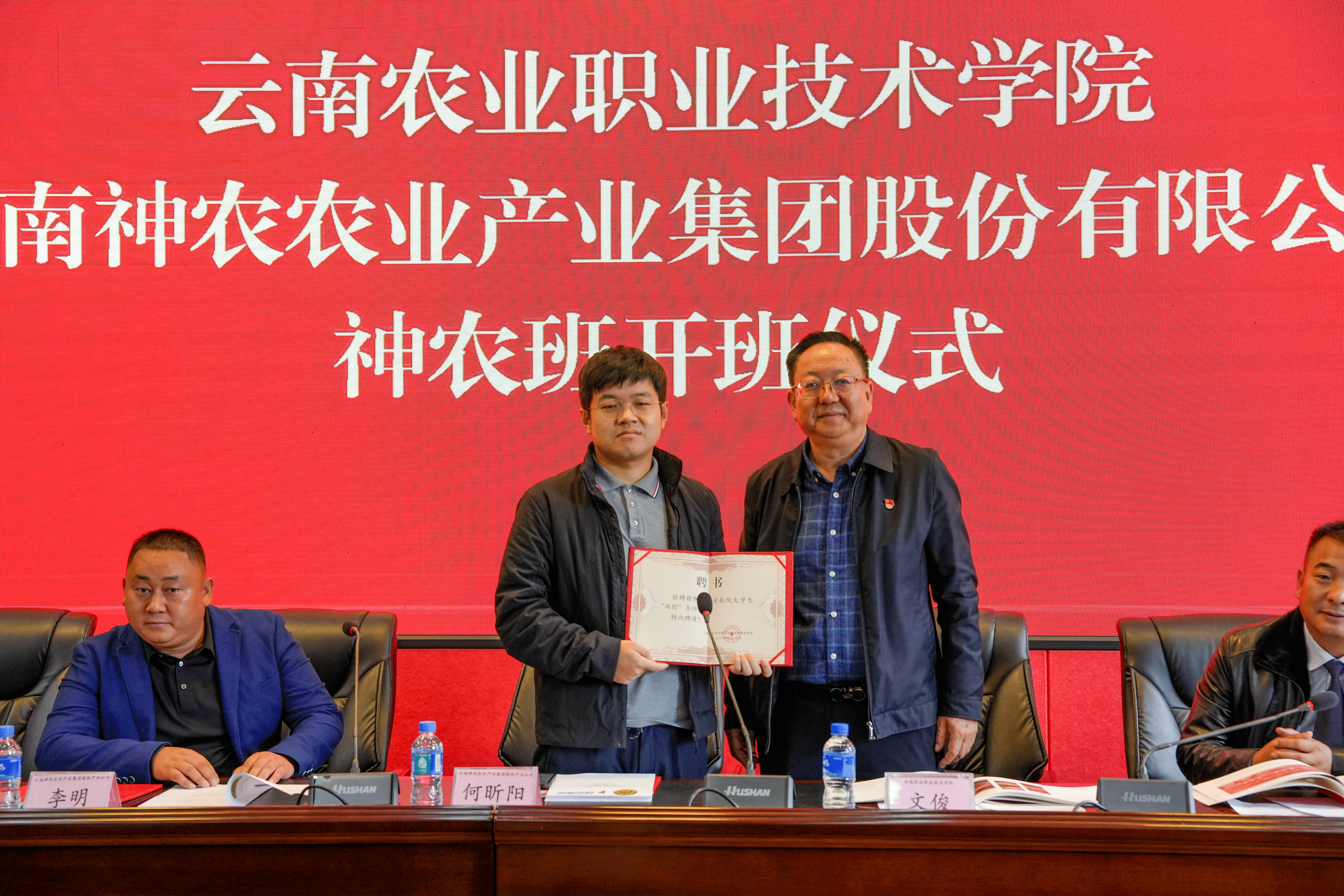 伴随着阵阵掌声,我院党委书记文俊为云南神农集团总裁助理何昕阳颁发大学生“双创”导师聘书,此次开班仪式标志着我院与云南神农集团在合作办学方面迈出了坚实的一步。