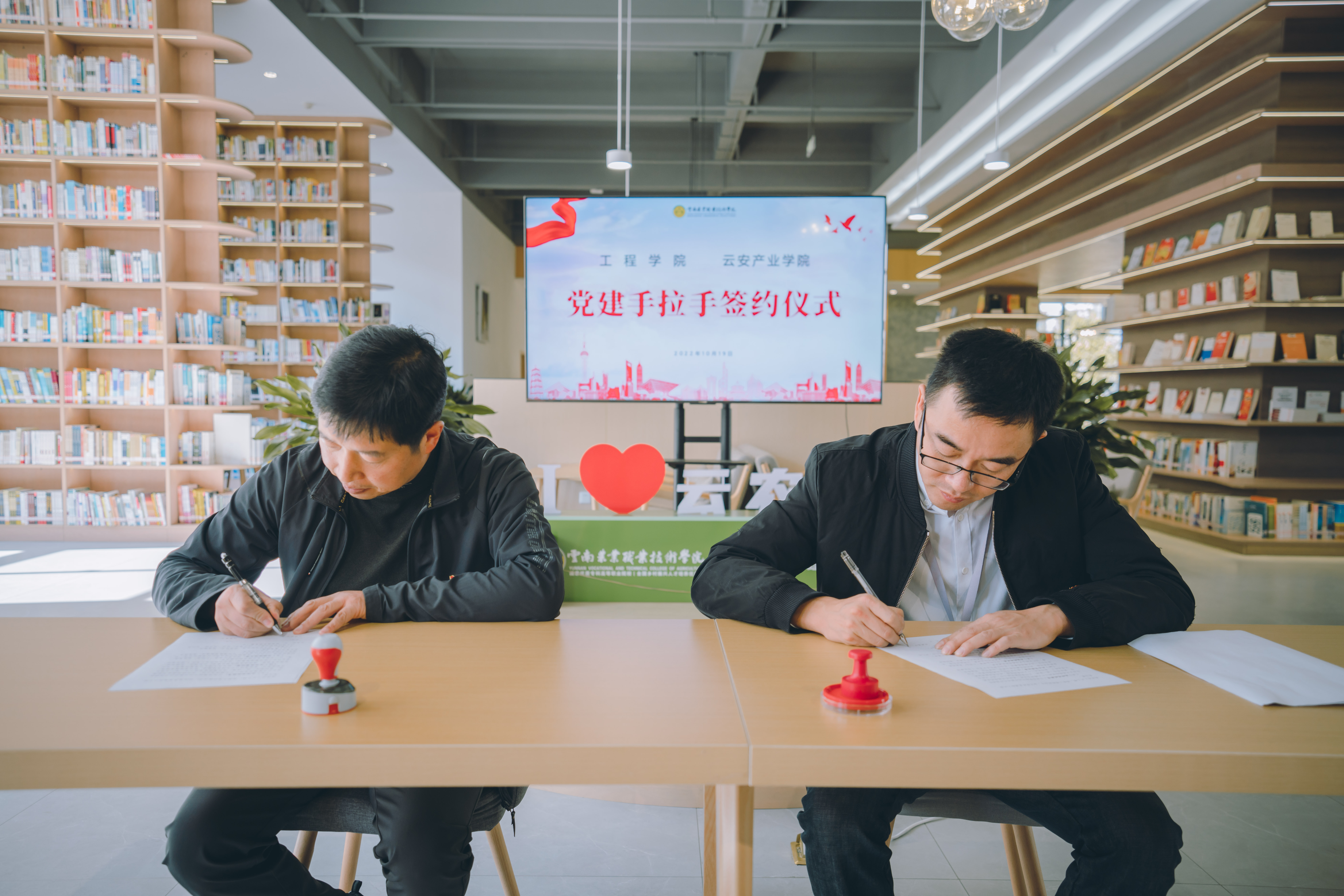 通知中心为营造学习宣传党的二十大的良好氛围,实现工程学院党总支与云安产业学院党总支优势互补,充分发挥党建引领作用,努力构建“资源共享、优势互补、互相促进、共同提高”的党建工作新格局,推动各项工作高质量开展,10月19日下午,工程学院党总支与云安产业学院党总支在云安产业学院图书馆开展党建工作“手拉手”活动启动仪式。党委委员、工程学院党总支书记王军明同志及全体总支委员,云安产业学院党总支书记李一源及全体总支委员出席启动仪式。启动仪式由李一源同志主持。