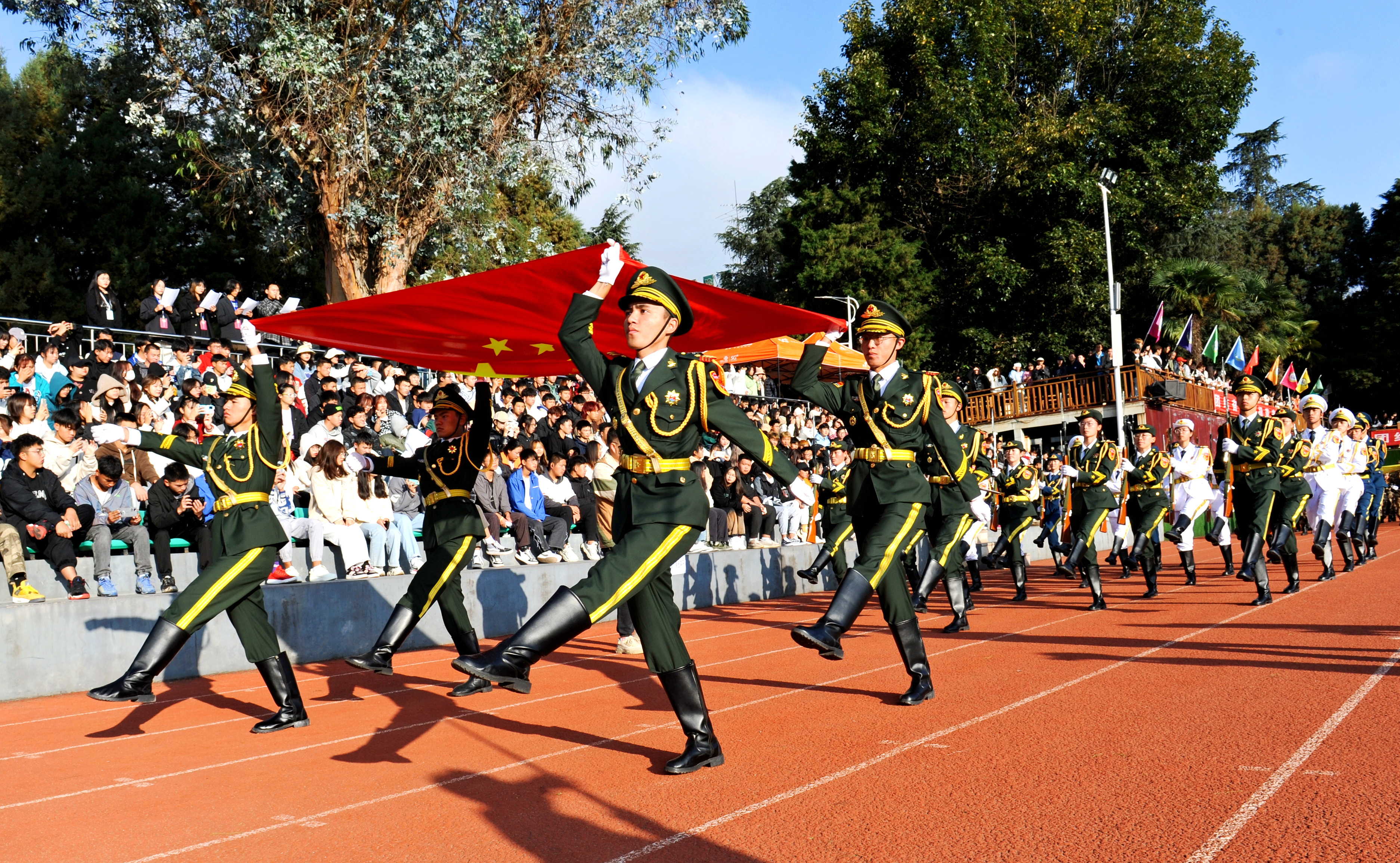 在隆重的升旗仪式中,全场肃立、面向国旗,注视着五星红旗冉冉升起、飘扬在运动场的上空。