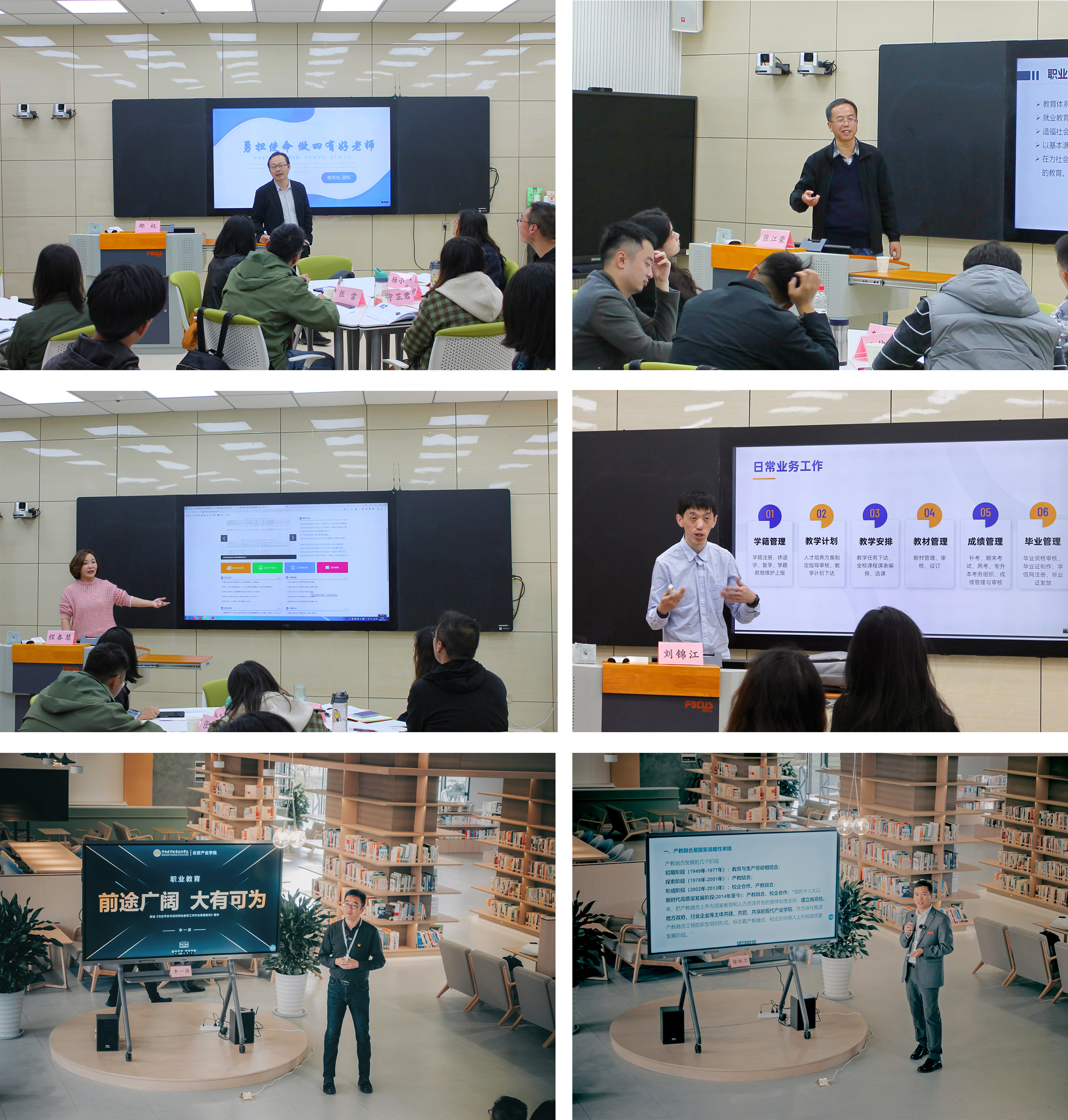 教务处、财务处和现代教育技术与信息中心等职能部门负责人和优秀骨干教师,云安产业学院院长、书记分别向新教师介绍了学校日常教学管理、教学信息化工具、财务管理、职业教育未来发展趋势、职教背景下的好教育好老师和好课堂、产教融合模式下的发展等内容。