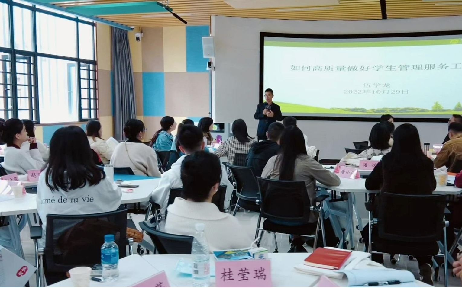 院长陈太安分析了学校的发展现状、定位和目标,介绍了近年来学校取得的成果和特色优势。并分享自身的从教感悟,希望与新教师一起齐心协力,不负期望,共同努力,为云农职的发展添砖加瓦!党委副书记伍学龙从学生的特点和学生工作的理念等多个角度出发,就如何做好班级管理工作、如何处理学生突发事件等方面提出真知灼见,并鼓励新教师们在教学中挖掘课程中的德育元素。