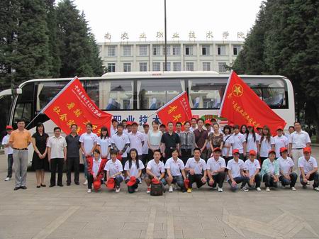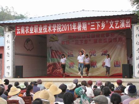 7月9日上午9:00,暑期三下乡出征仪式在茭菱校区举行,院党委副书记赵刚为“三下乡”活动讲话并授旗,三下乡实践活动拉开帷幕。几日的活动行程中,学院老师和志愿者们与石林县团委举行了座谈会;参观了石林锦苑花卉产业园;在石林县贫困乡村大可村发放相关农业知识手册、禁毒防艾宣传资料,并向当地农民朋友表演了精彩的“三下乡”文艺节目,将当代大学生对党的热爱之情诠释得淋漓尽致,赢得了父老乡亲们的一致好评。