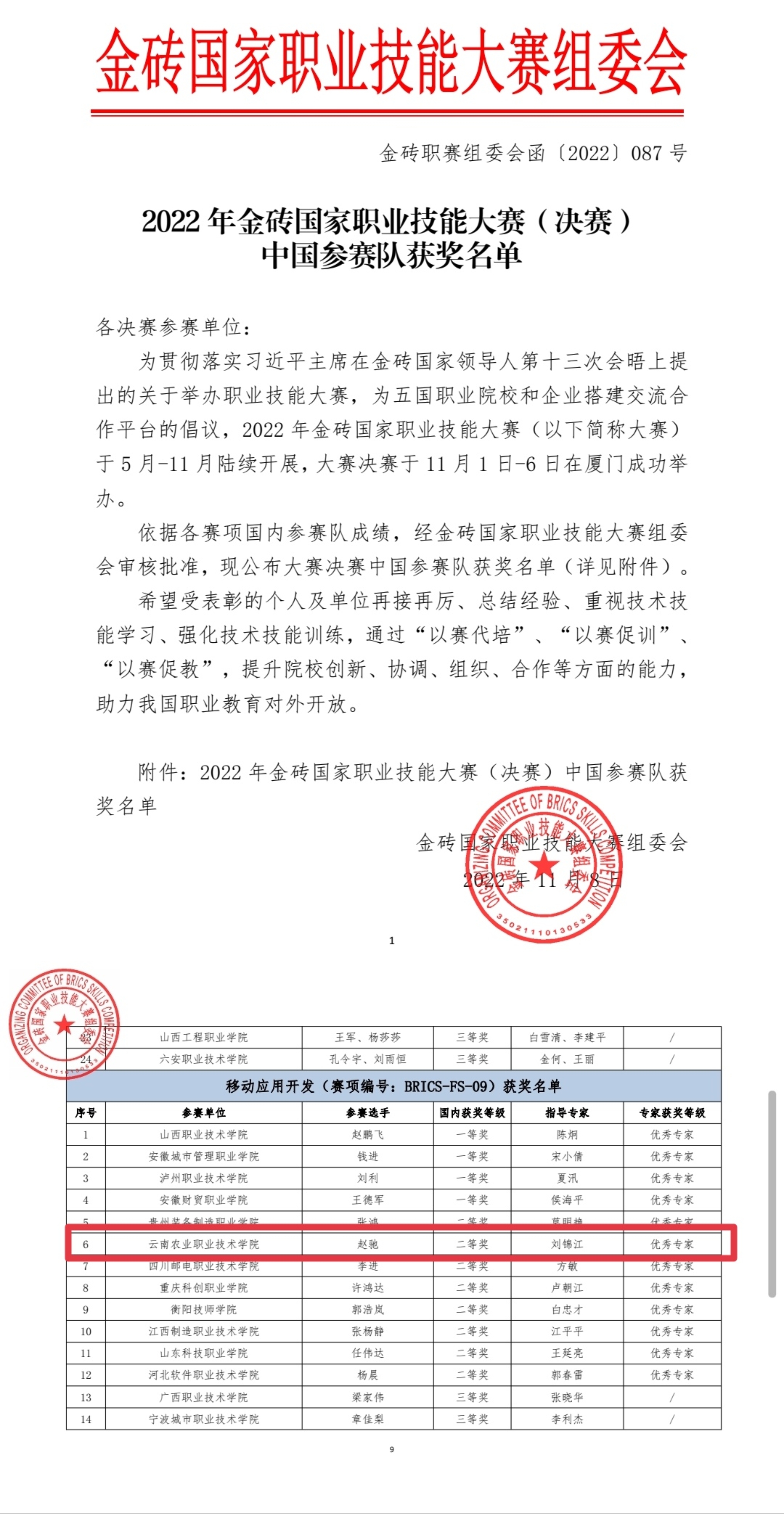 本次大赛由中华人民共和国教育部、中华人民共和国人力资源和社会保障部、金砖国家工商理事会、厦门市人民政府共同主办,大赛聚焦高端制造、数字经济、新产业、新业态、新技术等重点领域,包括启动赛和正式决赛两个阶段。决赛共有3585支国际参赛队和6282支国内参赛队在同等英文件操作环境下以线上线下相结合的形式竞技角逐。其中,互联网技术学院20级计算机应用技术六班赵驰在厦门线下参赛。自报名参赛以来,互联网技术学院领导高度重视,指导教师认真辅导,充分利用课外时间开展备赛工作,为参赛选手提供了强有力的保障。