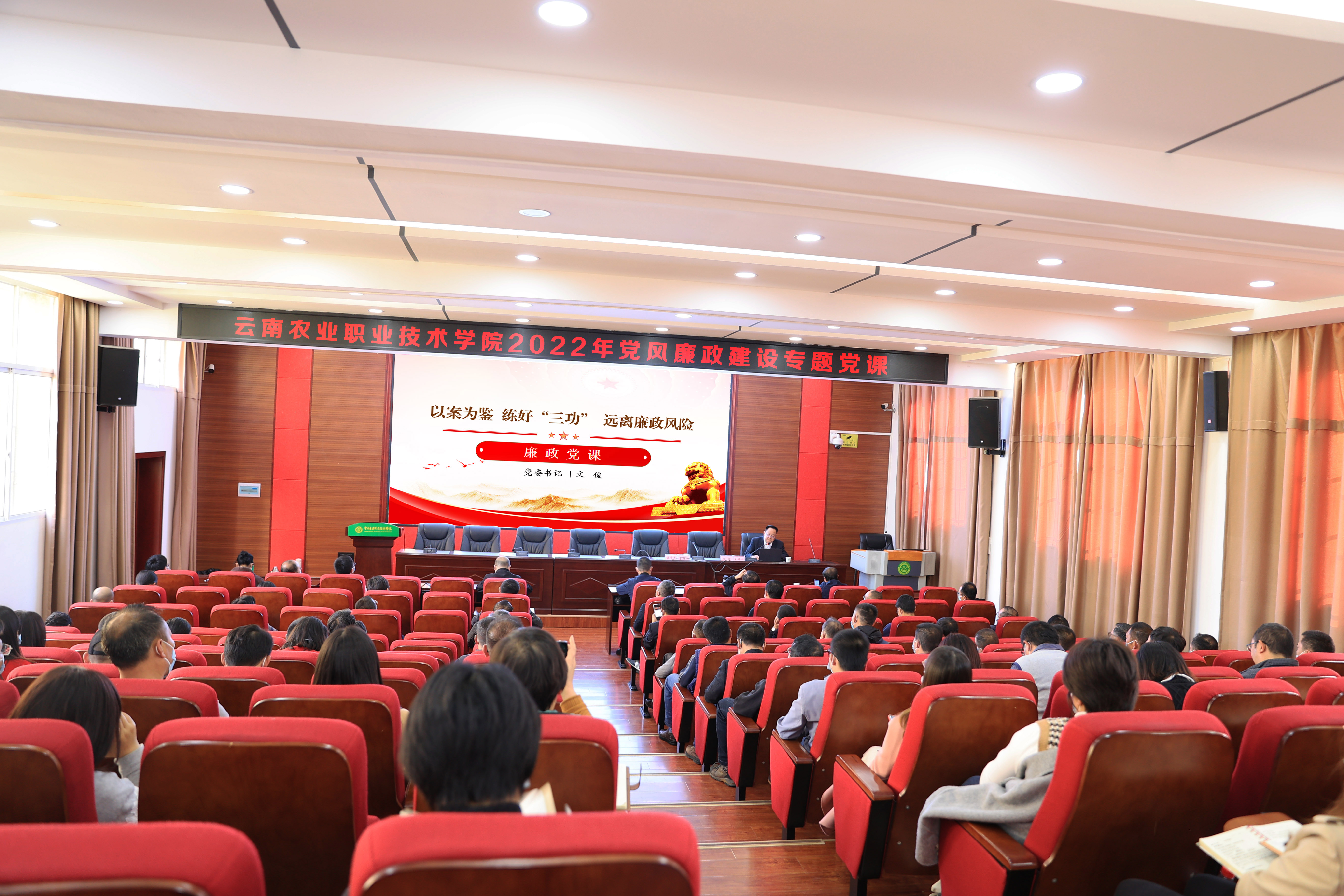 文俊书记从党的二十大报告第十五部分“坚定不移全面从严治党,深入推进新时代党的建设新的伟大工程”出发、学习领会习近平总书记中央纪委六次全会重要讲话精神和云南省第十一届纪律检查委员会第二次全体会议精神,结合身边案例和高校工作实际,从要练好思想上的“内功”、要有守住廉洁自律的“防功”,到要有分清公与私的“硬功”等方面,用一个个鲜活的案例、一个个缺失廉洁意识的故事,直击大家灵魂深处,引发深思。文俊书记指出,党员干部一定要清醒地认识当前面临的形势和任务,牢固树立底线意识,清楚底线内容,时刻警醒逾越底线的严重后果,始终警示自己坚守底线,老老实实做人,踏踏实实干事。他希望大家堂堂正正干立德树人事,清清白白做清廉学校建设者,持续推进作风革命效能革命,不断提升学院校风、教风、学风,巩固好清廉农职建设的成果,保障学院各项事业高质量发展。